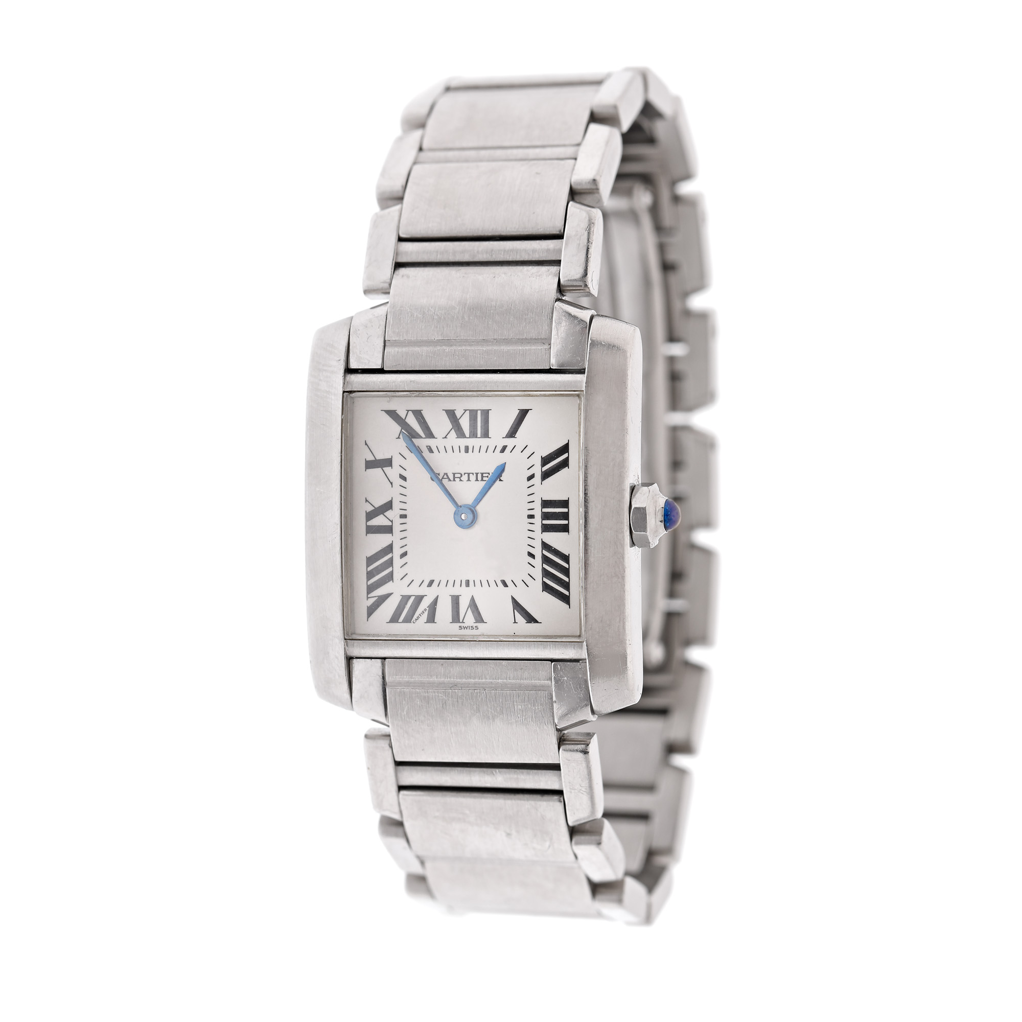 Ceas Cartier Tank Française, de mână, unisex, referință W51008Q3. Mecanism quartz, calibrul 057. Cadran de culoare alb, indici cu numerale romane. Brățară originală, din oțel inoxidabil, cu sistem de închidere de tip deployant.