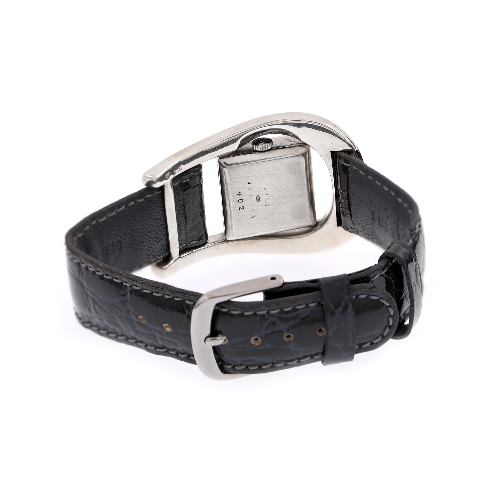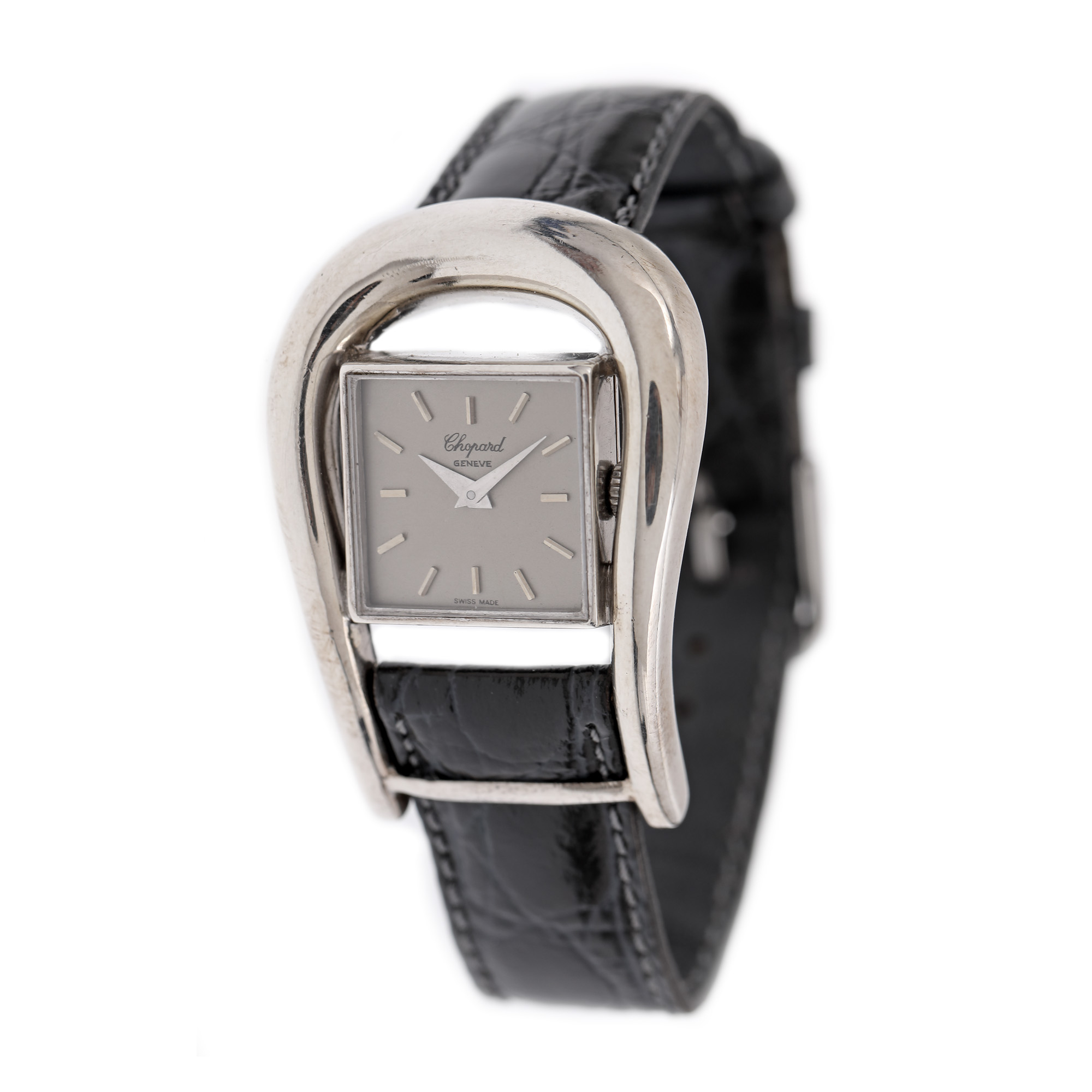 Ceas Chopard, din argint, de mână, de damă.Mecanism cu armare manuală. Cadran de culoare gri, indici baghete. Curea adăugată aftermarket, din piele, de culoare gri, cu sistem de închidere clasic. Accesorii: cutia originală, cureaua originală.