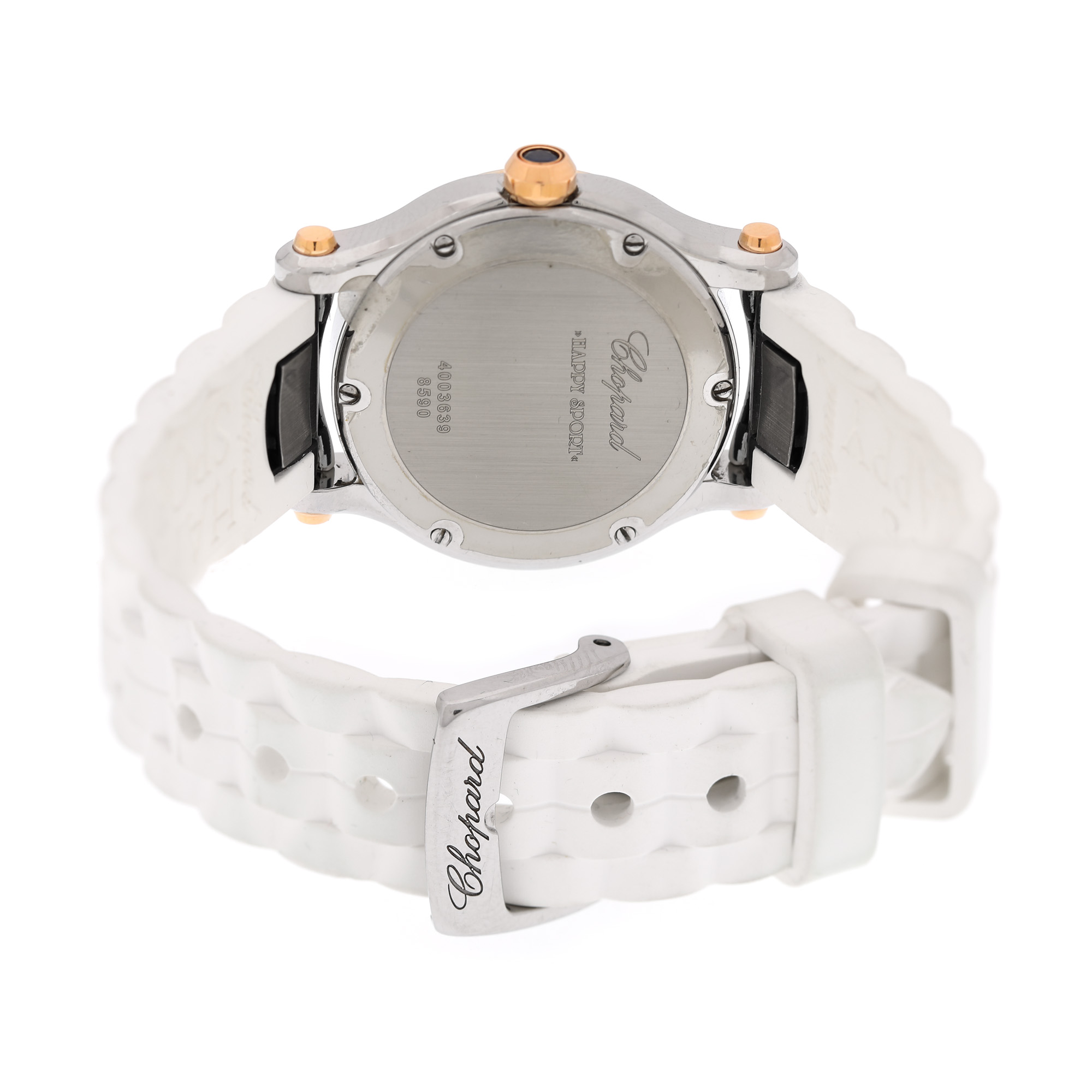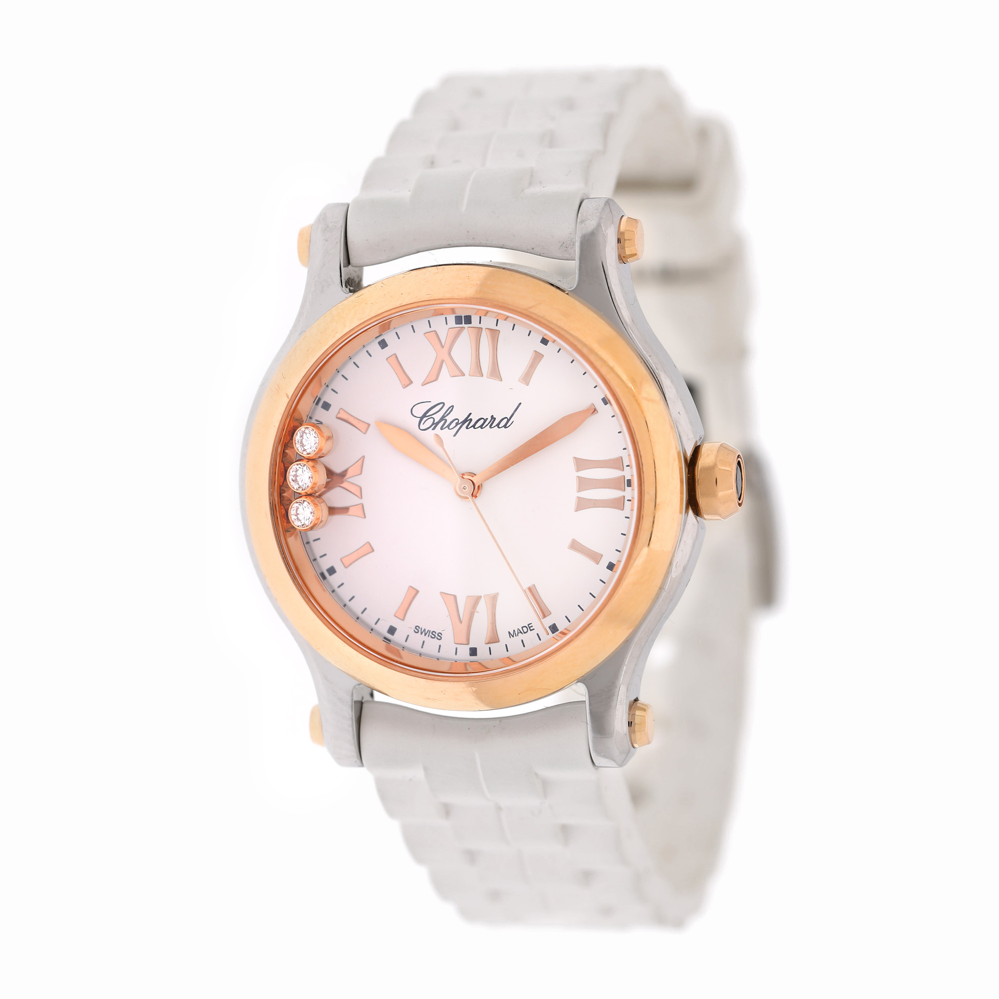 Ceas Chopard Happy Sport, din aur și oțel, cu diamante, de mână, de damă, referință 278590-6001. Mecanism quartz, cadran de culoare alb, indici cu numerale romane. Curea originală, din cauciuc, de culoare albă, cu sistem de închidere de tip clasic.