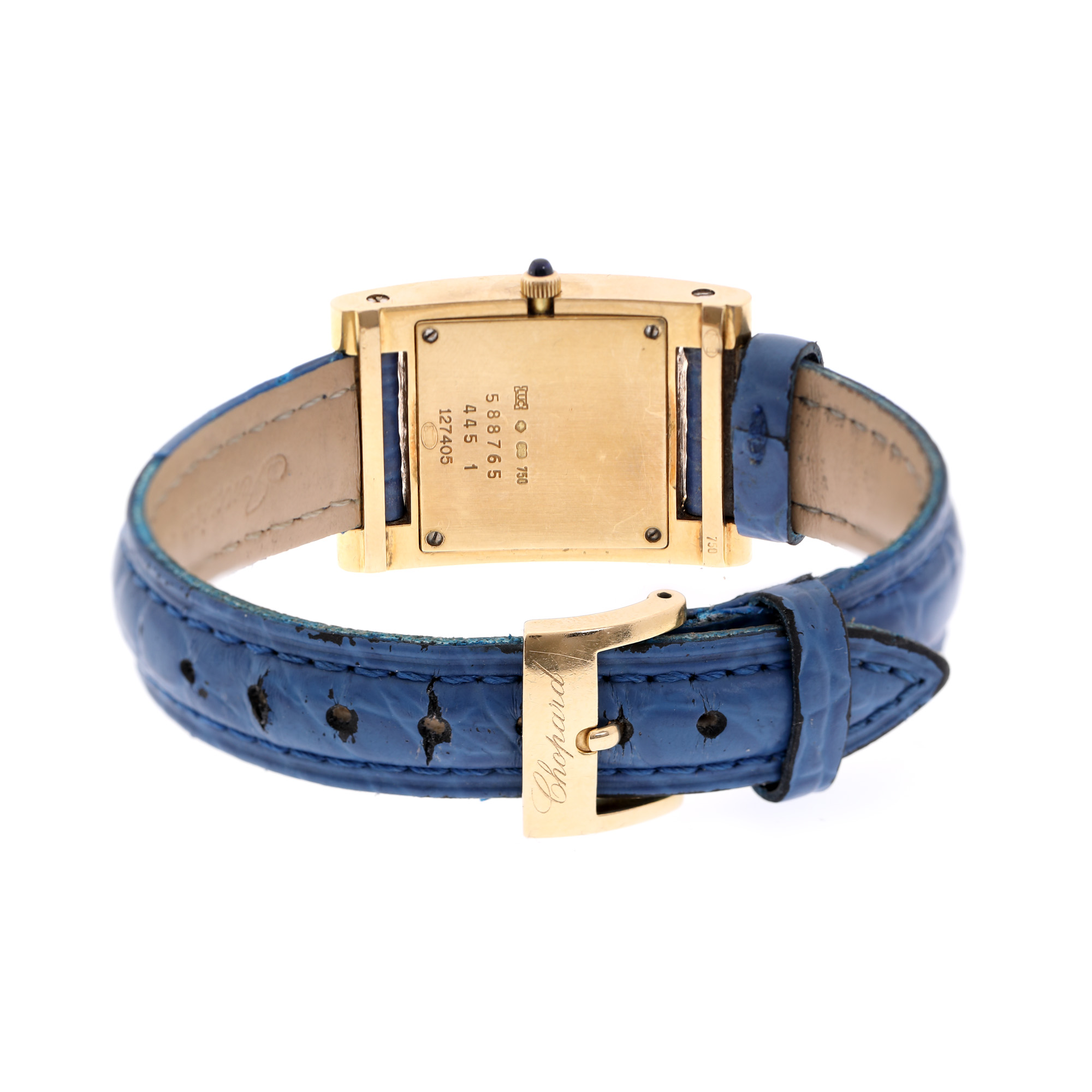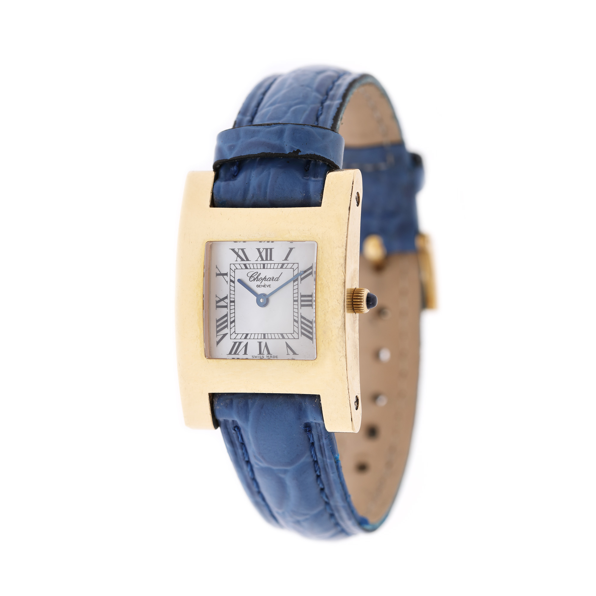 Ceas Chopard Your Hour, din aur, de mână, de damă, referință 445-1. Mecanism quartz. Cadran din sidef, indici numerale romane. Curea adăugată aftermarket, din piele, de culoare albastră, cu sistem de închidere clasic, cu catarama originală din aur.