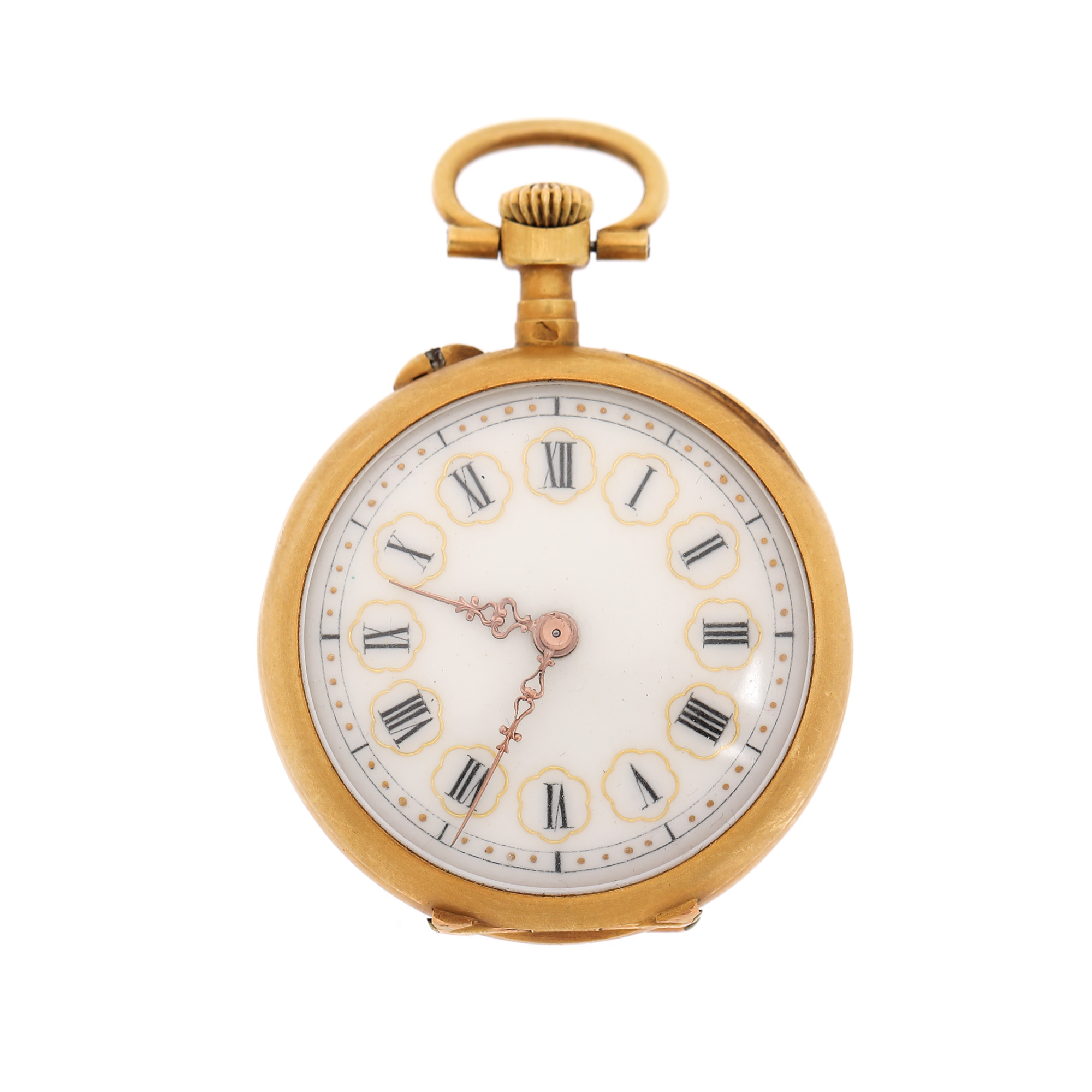 Ceas din aur, de buzunar, de damă, în stil neoclasic. Cadran de culoare alb, indici cu numerale romane.