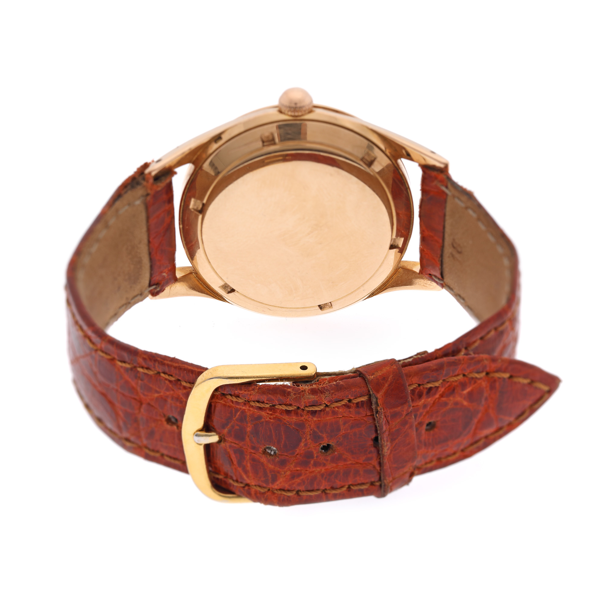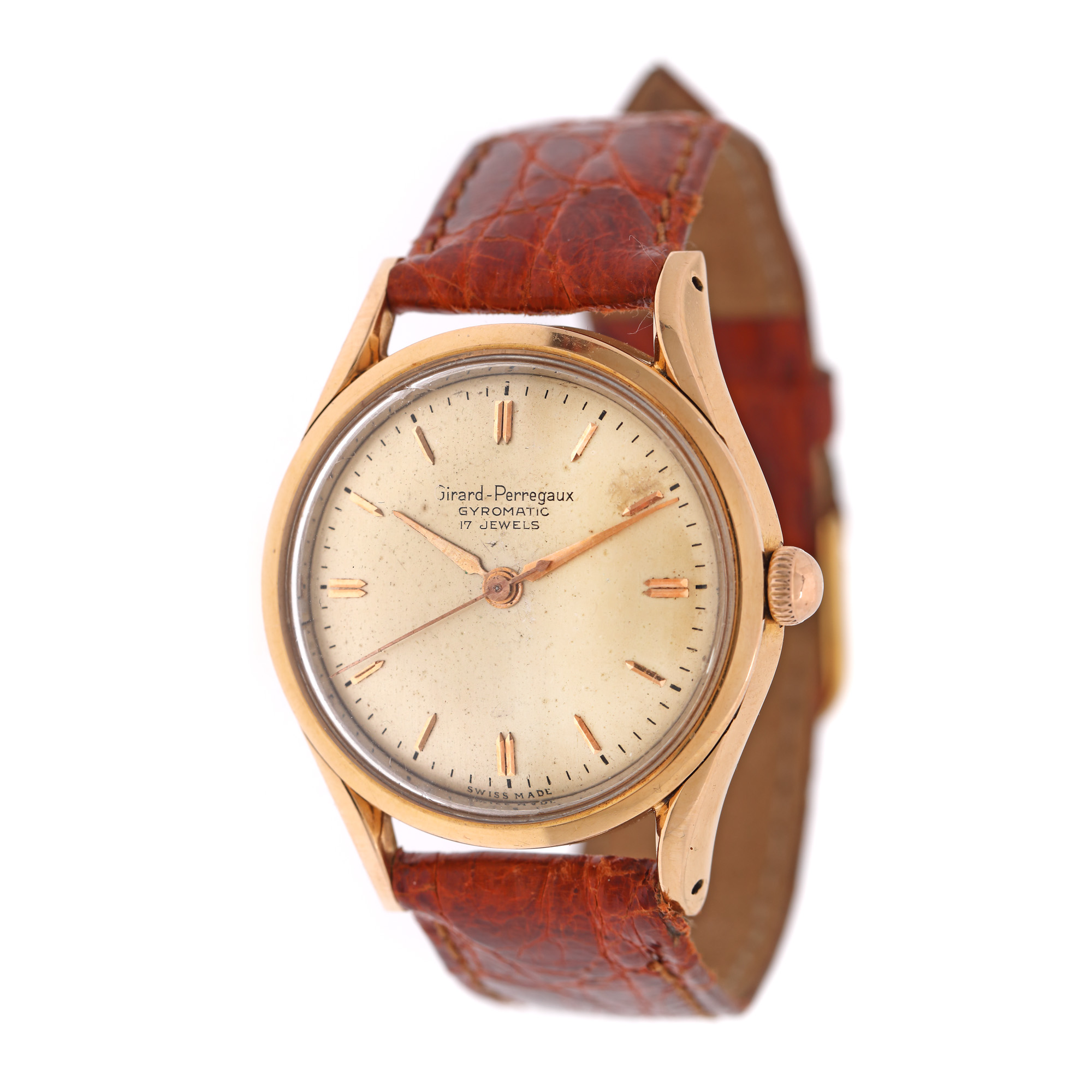 Ceas Girard Perregaux Gyromatic, din aur, de mână, bărbătesc. Mecanism automatic, calibrul 47AE 638. Cadran de culoare auriu, cu indici baghetă din aur. Curea adăugată aftermarket, din piele, de culoare maro-roșcat, cu sistem de închidere de tip clasic.