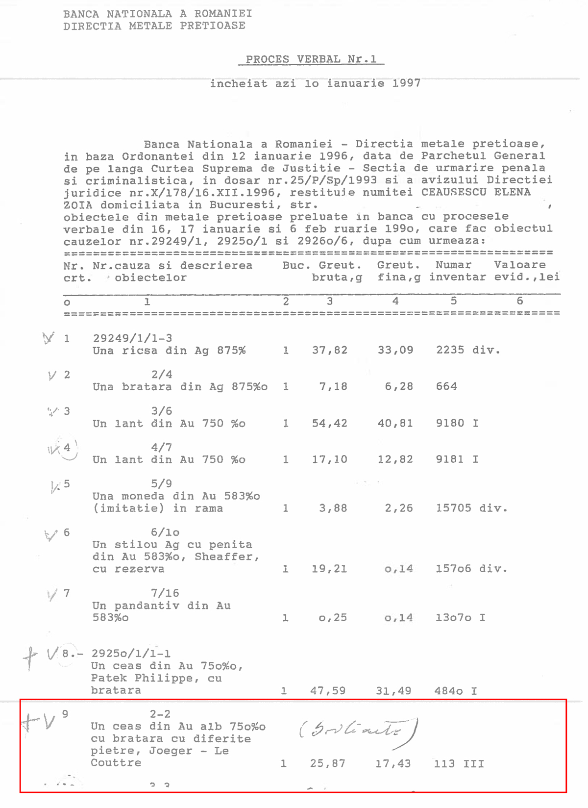 Ceas Jaeger LeCoutre din aur alb cu 58 de diamante totalizând 4.54 ct, de mână, de damă, ce a aparținut Zoiei Ceaușescu. Mecanism cu armare manuală. Cadran de culoare champagne, indici săgeți și puncte. Brățară originală din aur alb cu diamante, cu sistem de închidere cu clemă. Ceasul a fost confiscat la revoluție și retrocedat în anul 1997 de BNR.