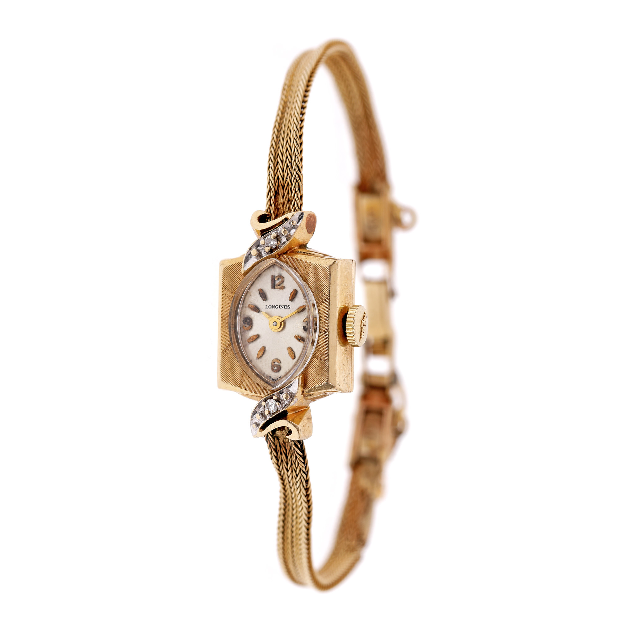 Ceas Longines, din aur, cu diamante, de mână, de damă. Mecanism cu armare manuală. Cadran de culoare auriu, indici numerale arabe pentru orele 3, 6, 9, 12 și baghete pentru restul orelor. Brățară originală, din aur, cu sistem de închidere cu clemă.