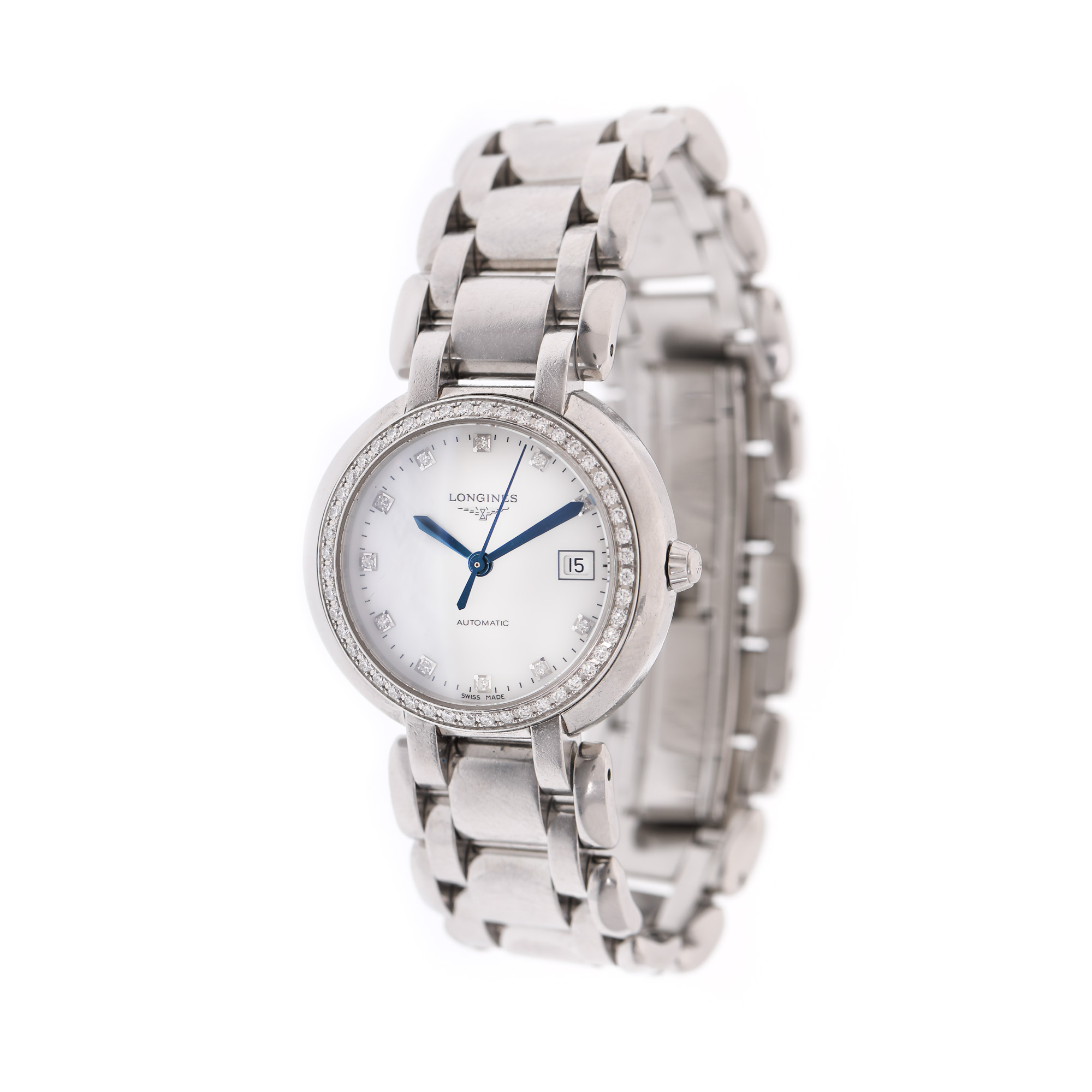 Ceas Longines Primaluna, cu diamante, de mână, de damă, referință L8.113.0.87.6. Mecanism automatic. Bezel decorat integral cu diamante. Cadran din sidef, indici diamante, registru pentru dată în dreptul orei 3. Brățară originală, din oțel, cu sistem de închidere de tip deployant.