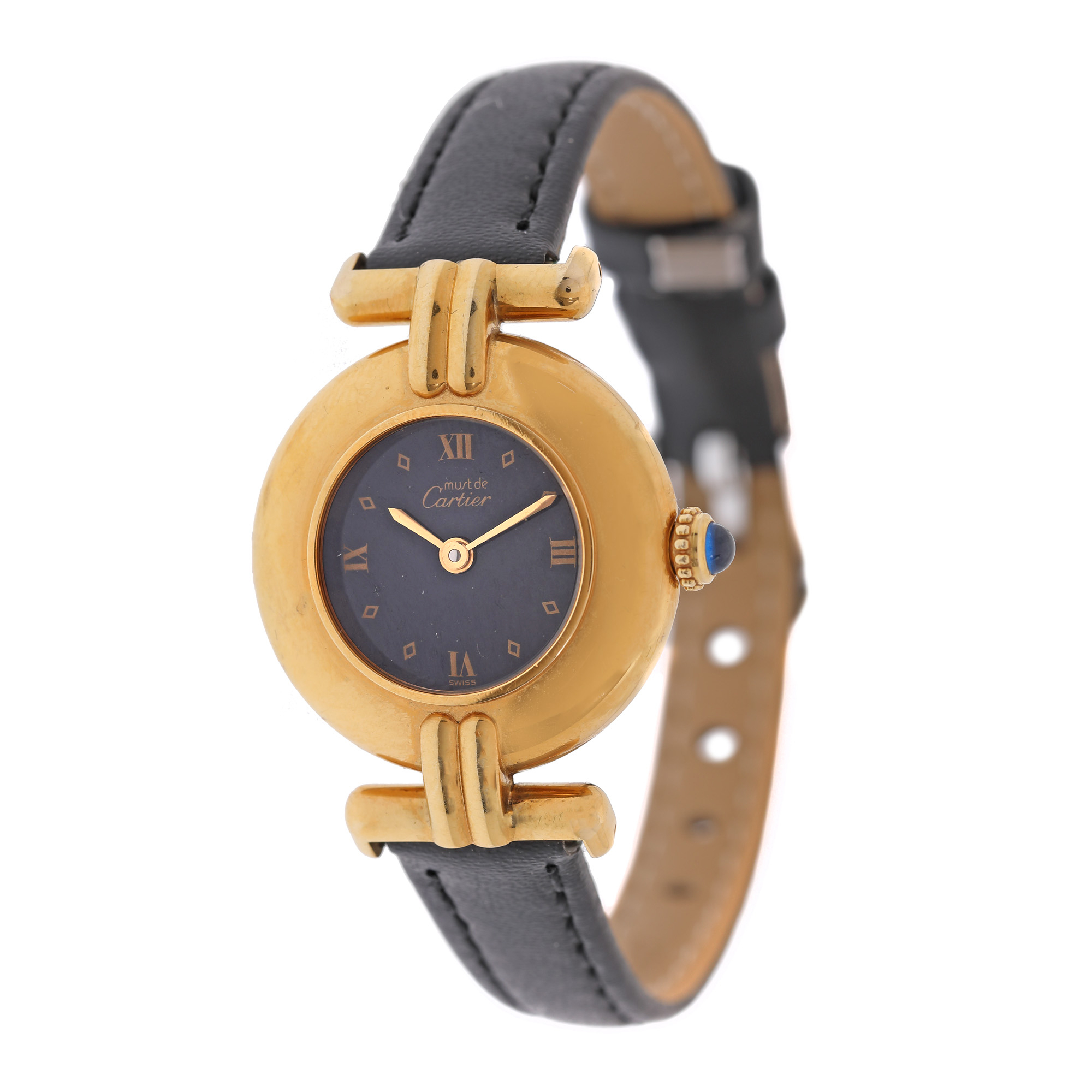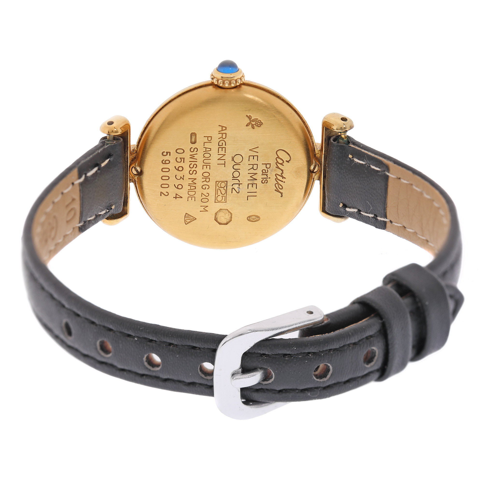 Ceas must de Cartier, din argint aurit, de mână, de damă. Mecanism quartz. Cadran de culoare negru, indici numerale romane pentru orele 3, 6, 9, 12 și romburi pentru restul orelor. Curea adăugată aftermarket, din piele, de culoare neagră, cu sistem de închidere clasic.