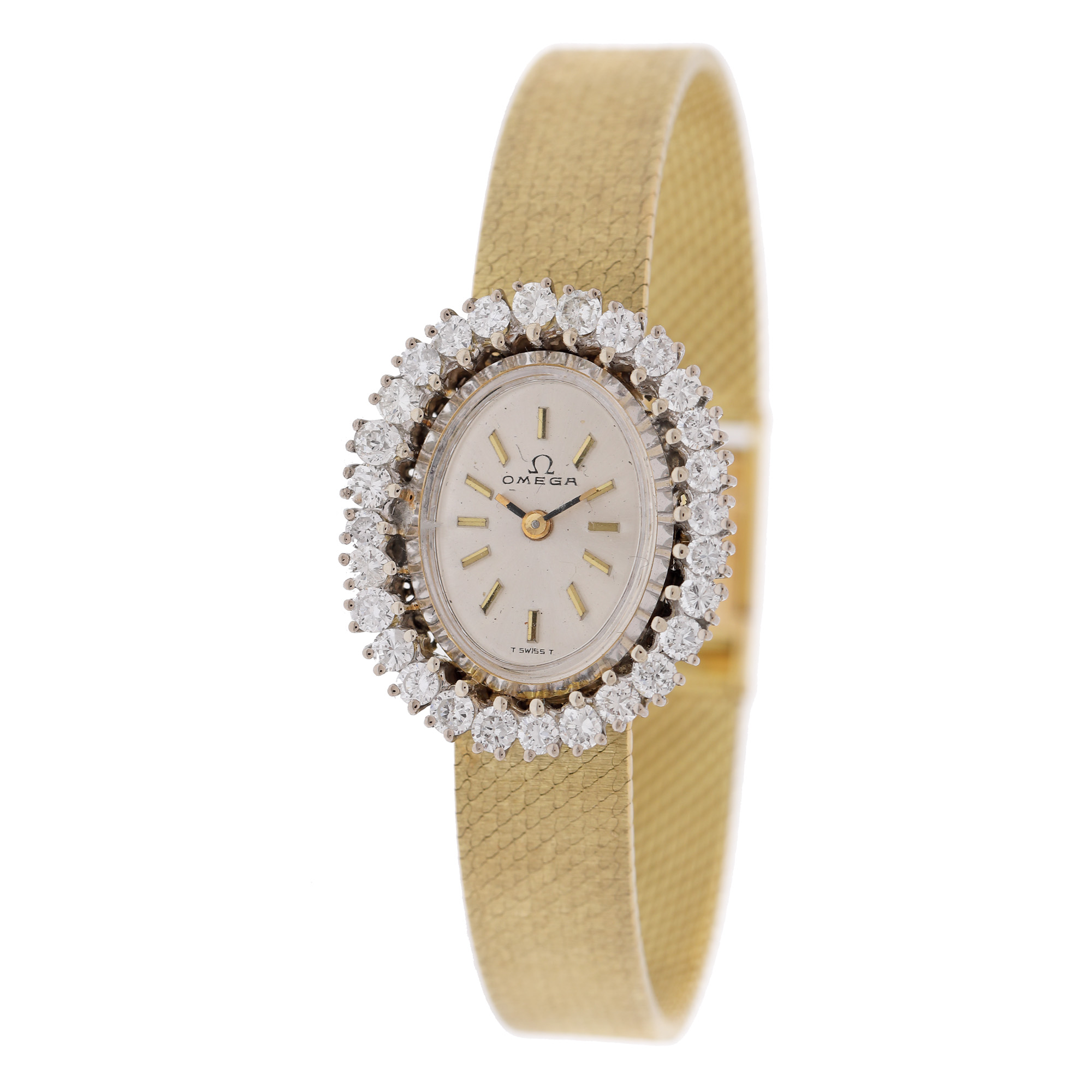 Ceas Omega din aur, decorat cu diamante, de mână, de damă. mecanism cu armare manuală. Cadran de culoare champagne, indici baghete. Bezel ornat integral cu diamante. Curea originală, din aur, cu sistem de închidere cu clemă.