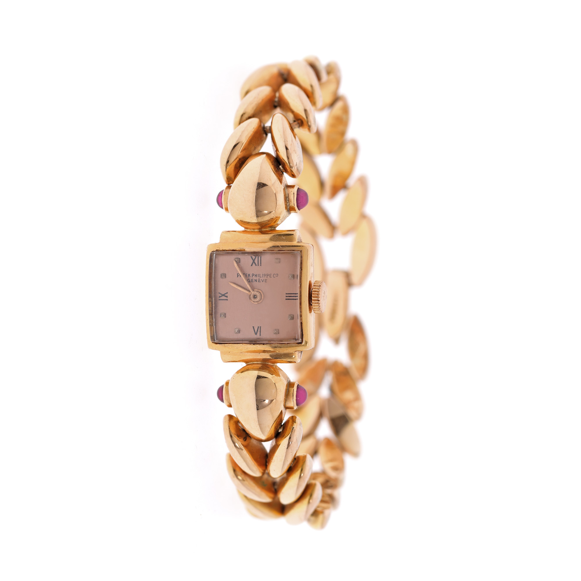Ceas Patek Philippe, din aur cu rubine, de mână, de damă. Mecanism cu armare manuală. Cadran de culoare auriu cu indici numerale romane pentru orele 3, 6, 9 și 12 și puncte pentru restul. Brățară originală, din aur, cu sistem de închidere cu clemă.