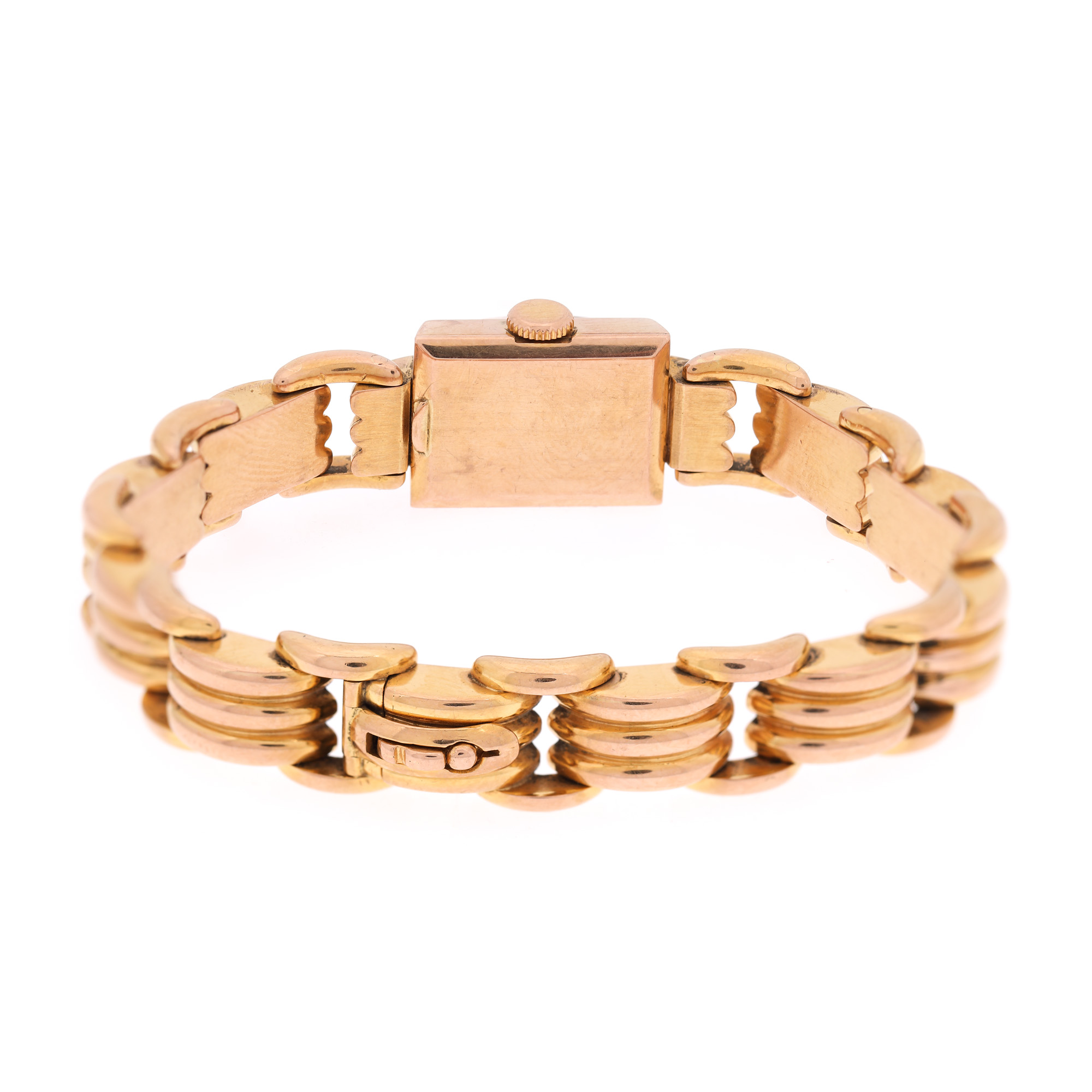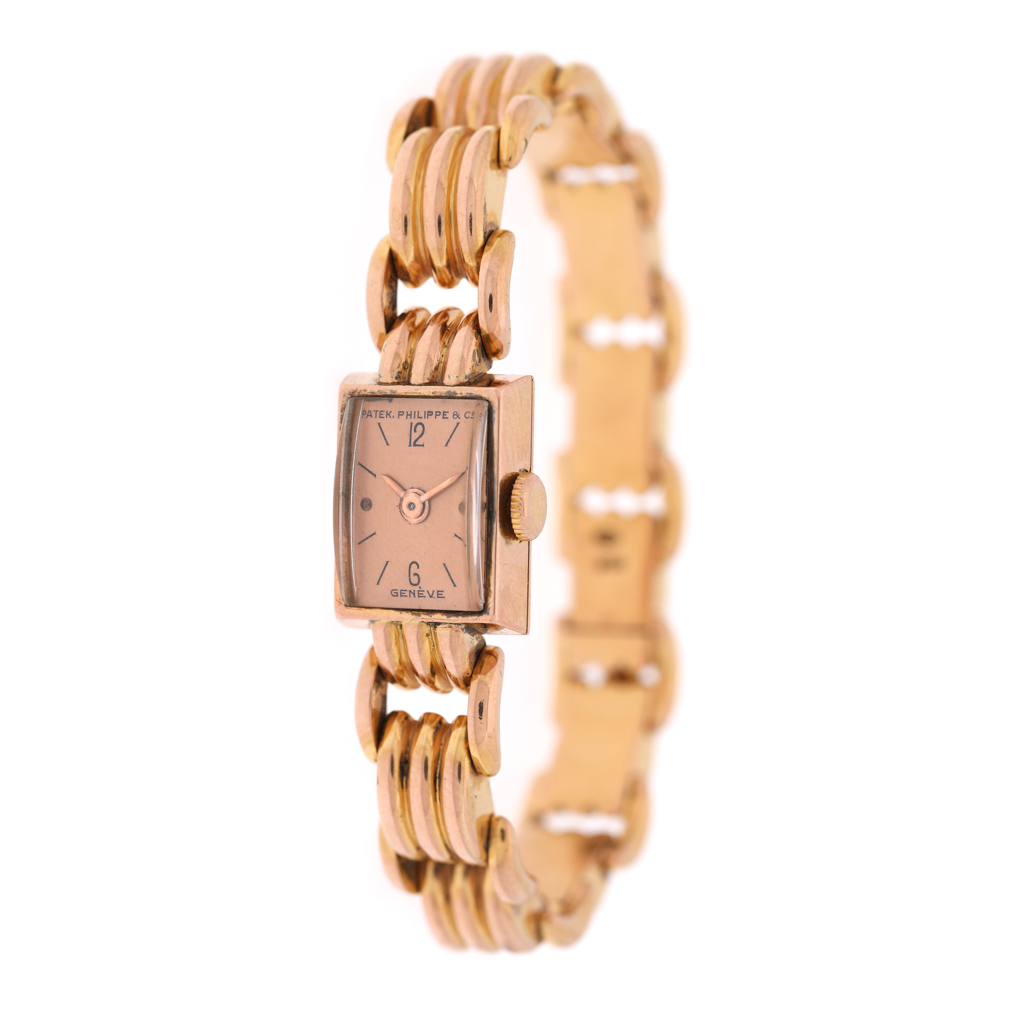 Ceas Patek Philippe vintage, din aur, de mână, de damă, mecanism cu armare manuală. Cadran rar, de culoare somon, inscripționat ''Patek Philippe & Co'', numerale arabe pentru orele 12 și 6. Curea din aur, cu sistem de închidere tip deployant, originale.