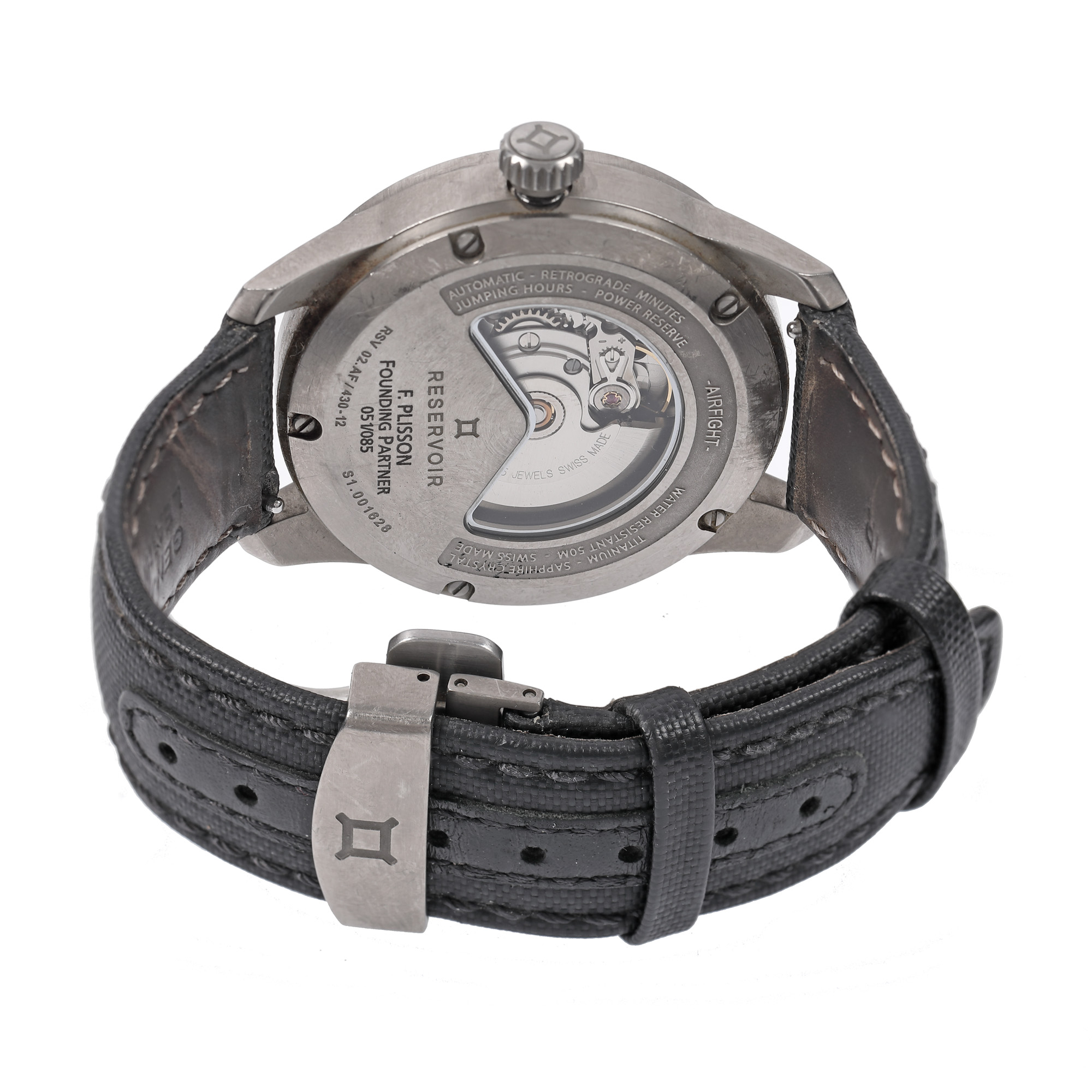Ceas Reservoir Airfight, de mână, bărbătesc, referință RSV02.AF/430-12. Mecanism automatic, cu funcție de jumping hours și afișaj al autonomiei, calibrul 2824. Cadran de culoare negru, indici cu numerale arabe, cu un registru pentru afișajul orei și unul pentru afișajul autonomiei în dreptul orei 6. Curea originală, din piele, de culoare neagră, cu sistem de închidere de tip deployant.