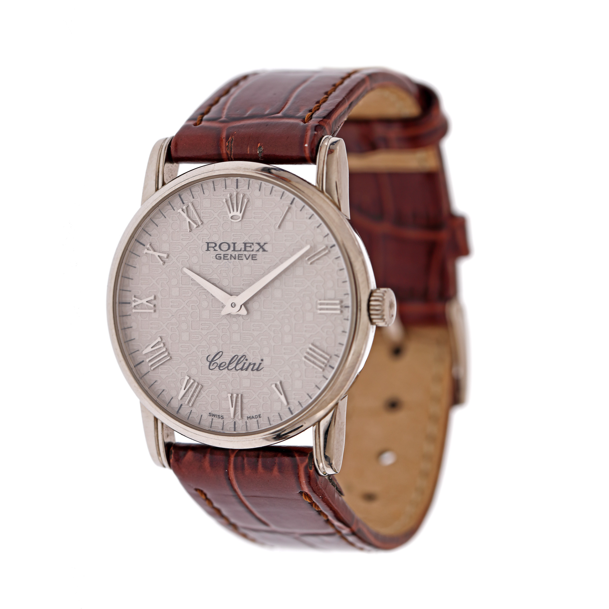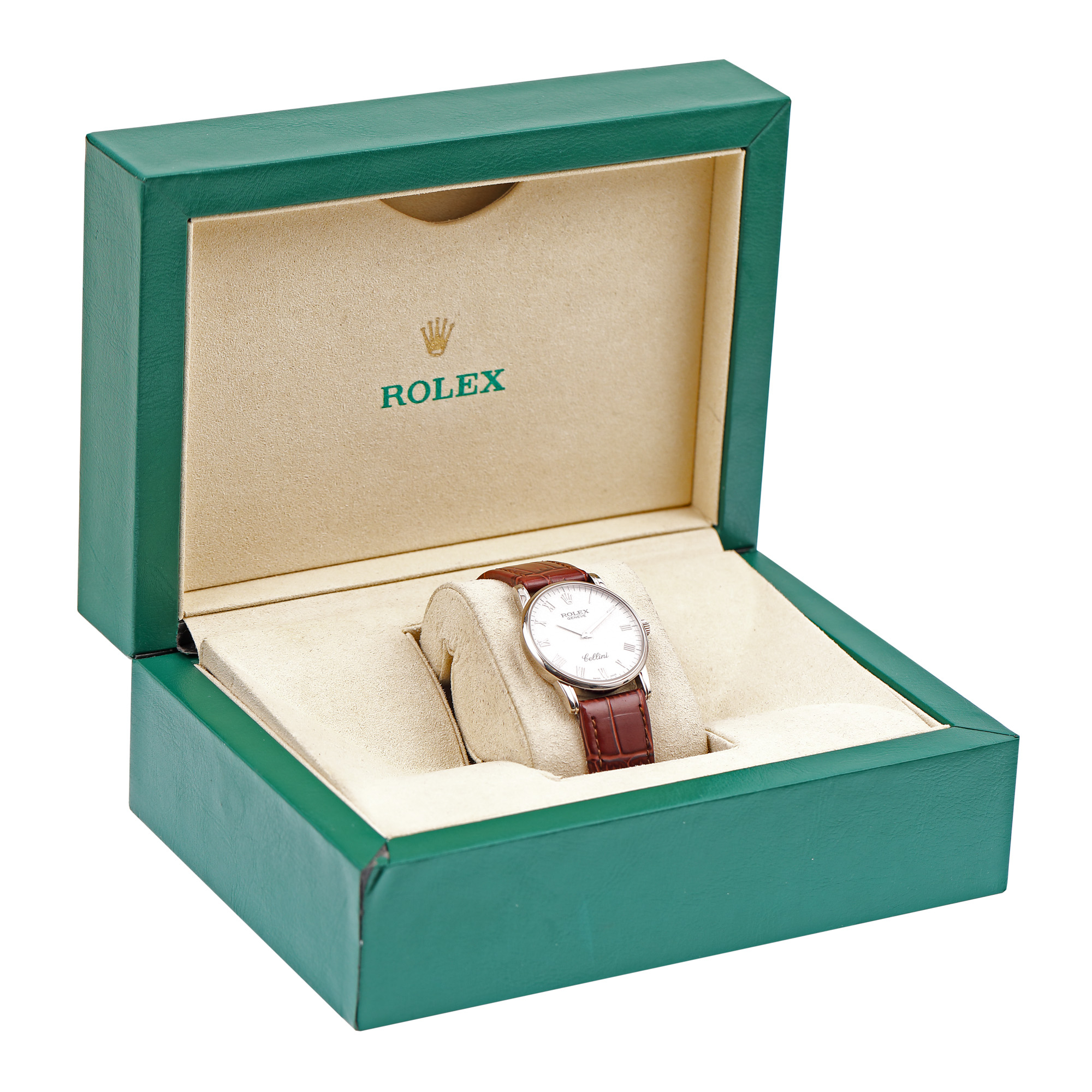 Ceas Rolex Cellini, din aur alb, de mână, unisex, referință 5116. Mecanism cu armare manuală, calibrul 1601. Cadran de culoare ivory, decorat cu monograma Rolex, indici cu numerale romane realizați din aur alb. Curea adăugată aftermarket, din piele, de culoare maro, cu sistem de închidere de tip clasic. Accesorii: cutia originală.