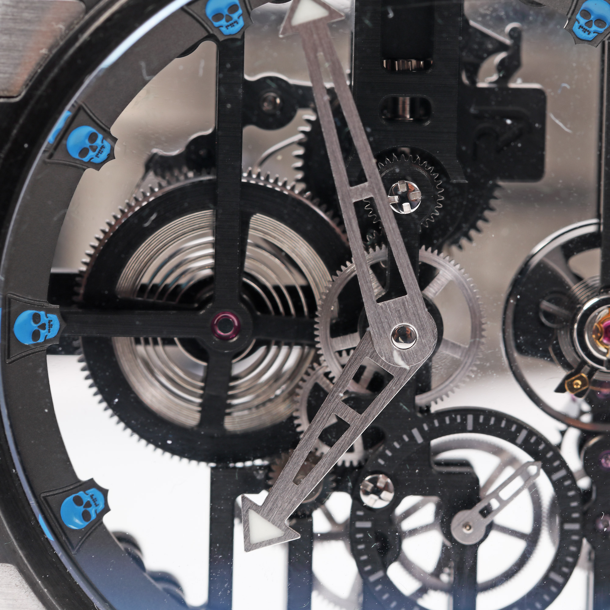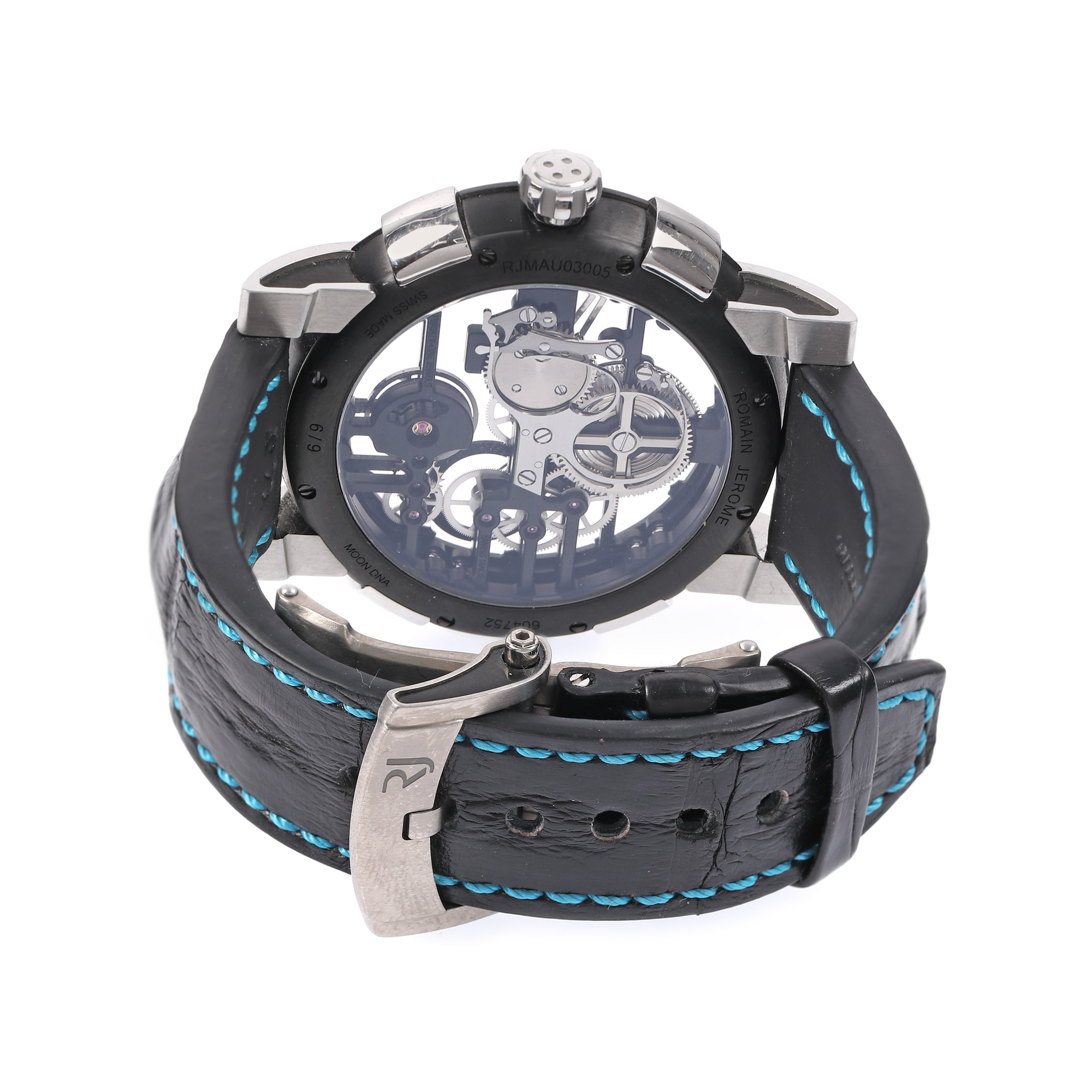 Ceas Romain Jerome Moon DNA, ediție limitată 6/9, de mână, bărbătesc, referință RJMAU3005. Mecanism cu armare manuală, calibrul RJ004M. Carcasă de tip skeleton, cadran transparent, indici-cranii de culoare albastră, cu un registru pentru secundar între orele 8 și 9. Curea originală, din piele și cauciuc, de culoare neagră, cu sistem de închidere de dip deployant.