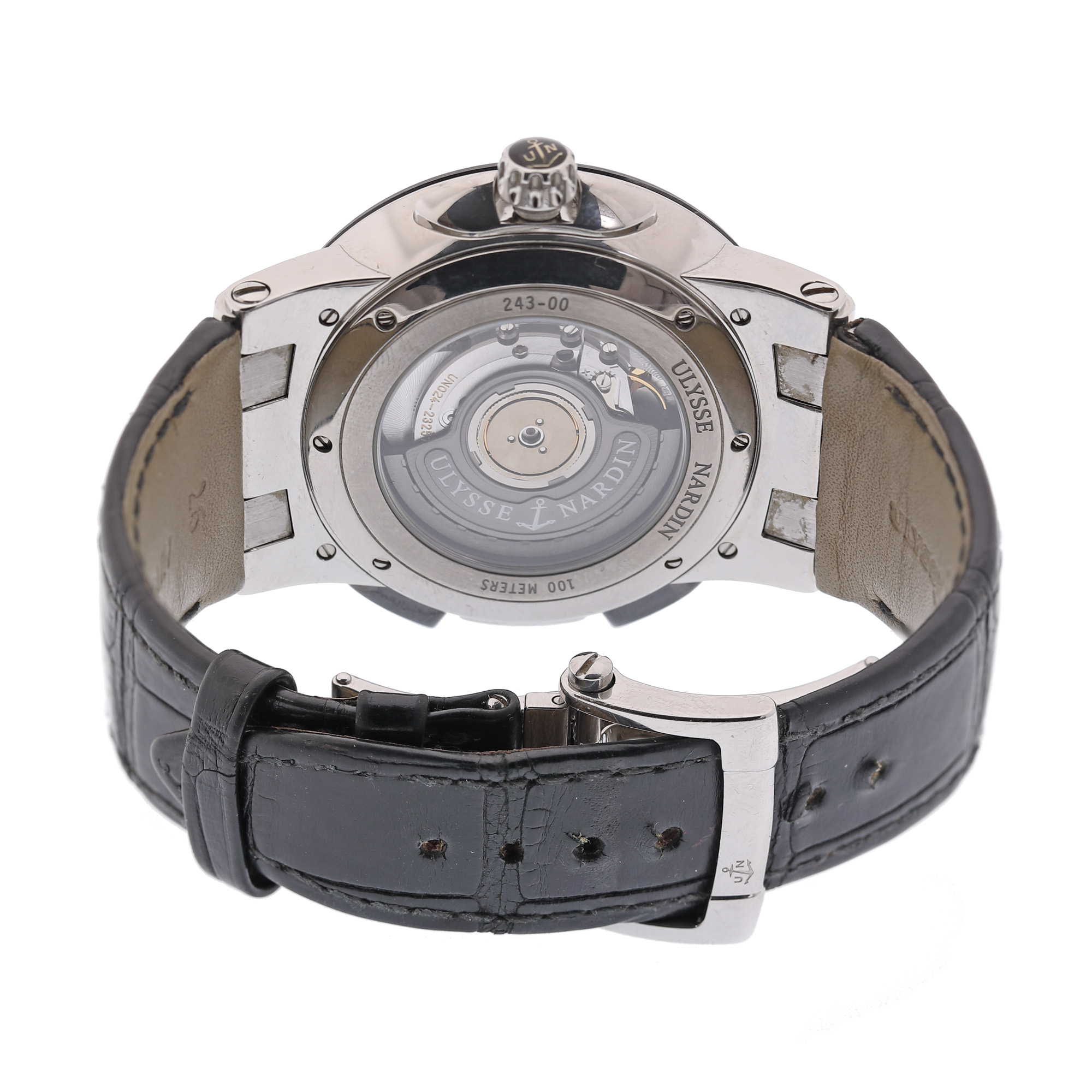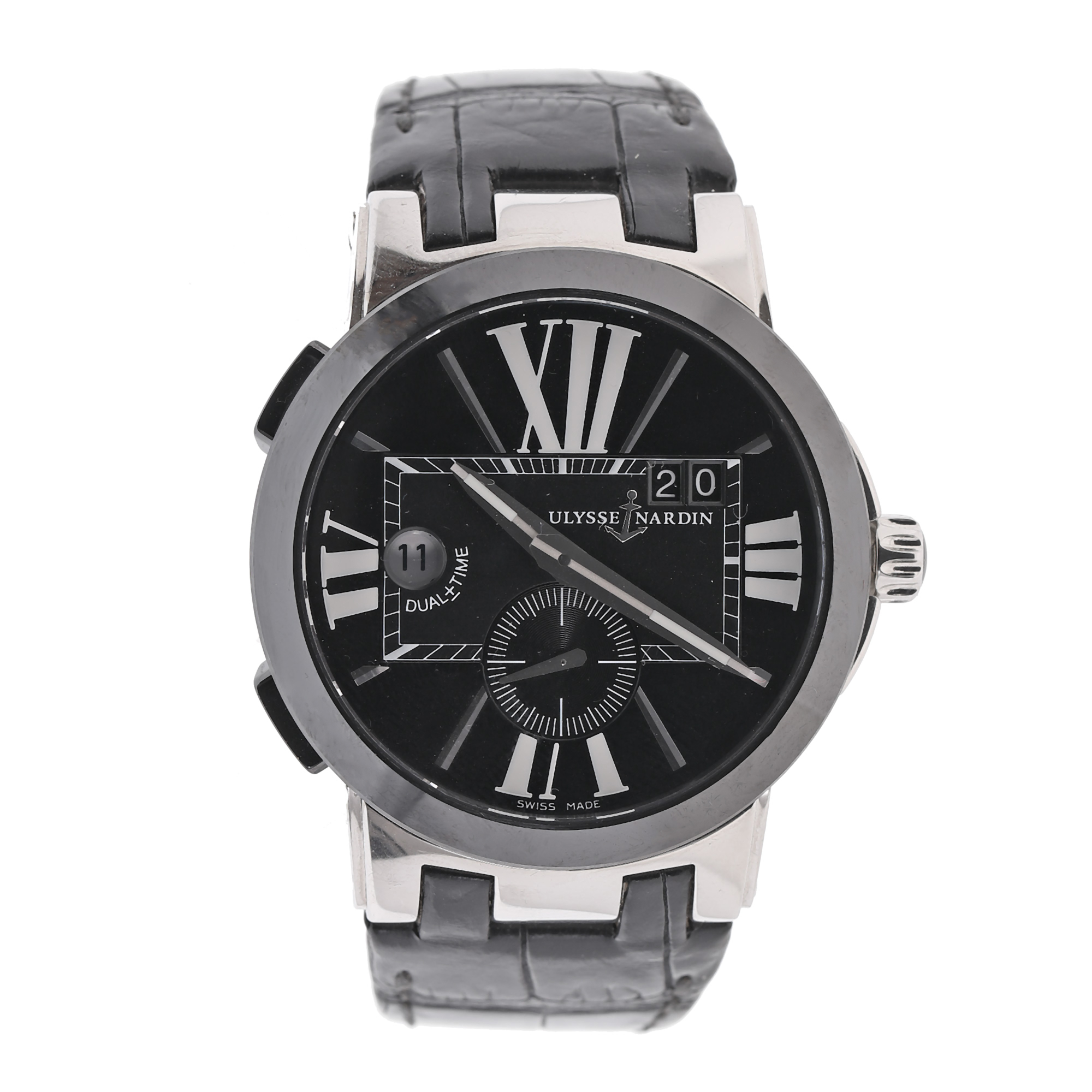 Ceas Ulysse Nardin Executive Dual Time, de mână, bărbătesc, referință 243-00. Mecanism automatic, calibrul UN 024, cu 34 de rubine, anterior vitrat. Cadran de culoare negru, indici numerale romane pentru orele 3, 6, 9, 12 și baghete pentru restul orelor, registru pentru dată în dreptul orei 2, registru pentru secundar în dreptul orei 6, registru pentru fus orar în dreptul orei 9. Curea originală, din piele, de culoare neagră, cu sistem de închidere de tip deployant.