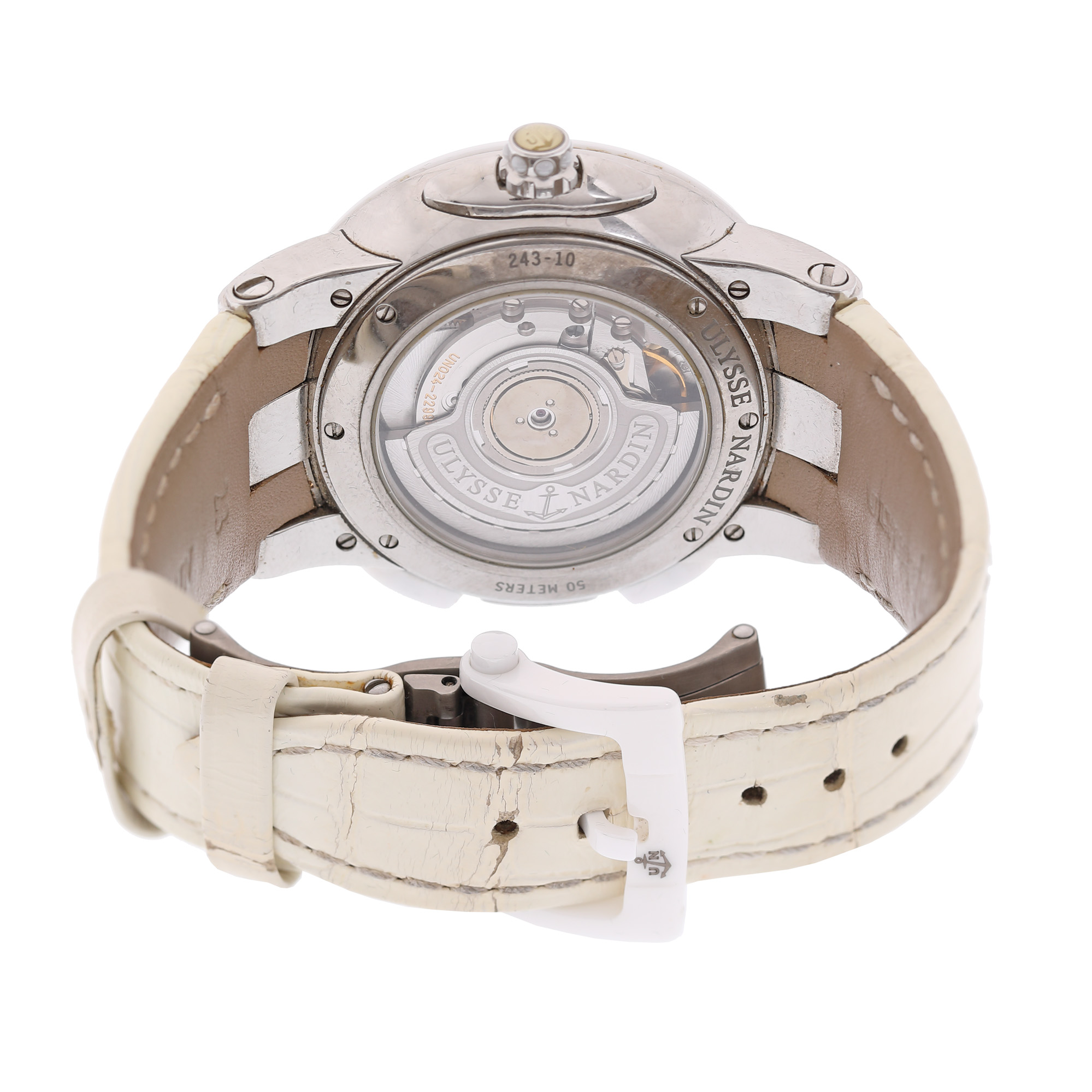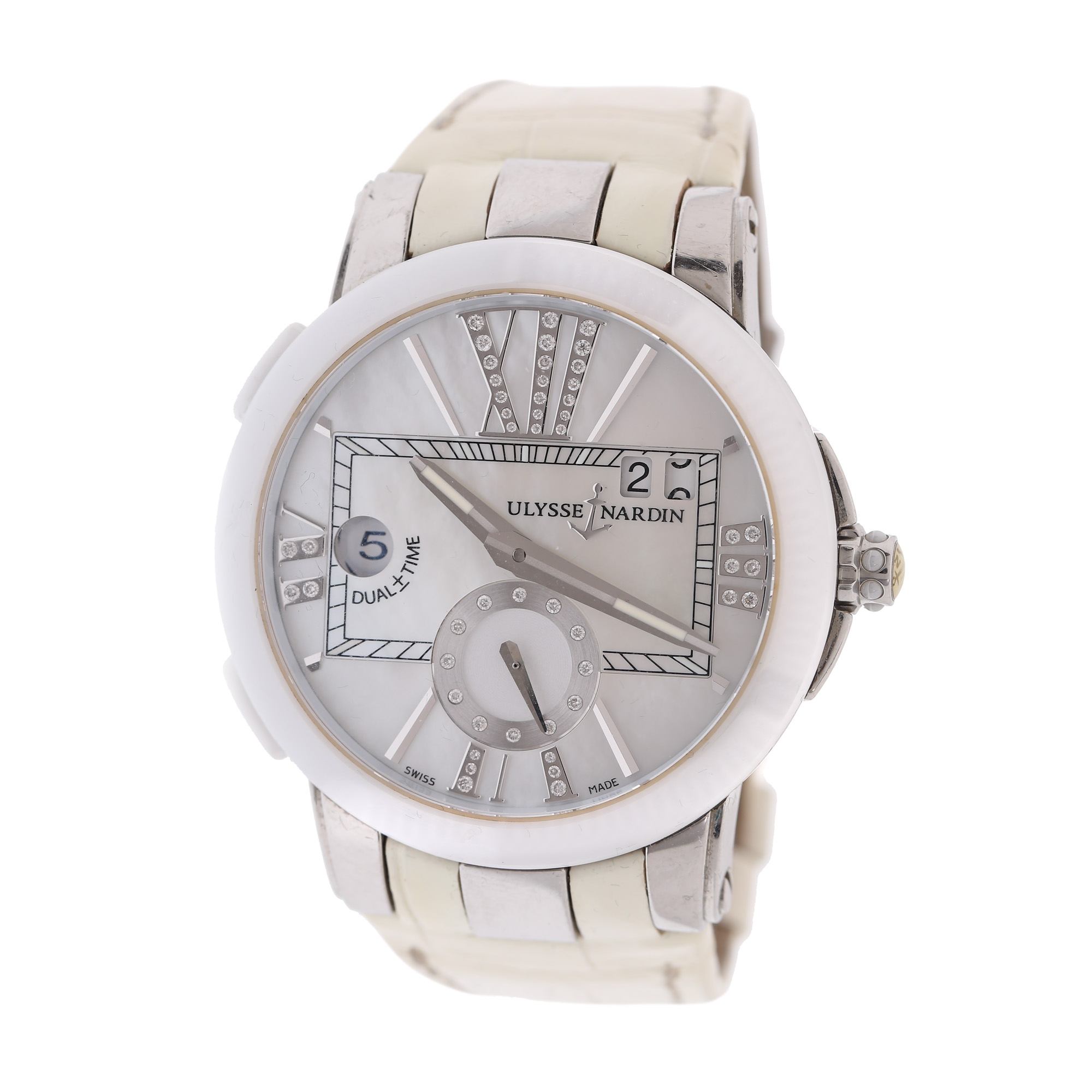 Ceas Ulysse Nardin Executive Dual Time Lady, de mână, bărbătesc, referință 243-10. Mecanism automatic, calibrul UN 024, cu 34 de rubine, anterior vitrat. Cadran din sidef, indici numerale romane decorate cu diamante pentru orele 3, 6, 9, 12 și baghete pentru restul orelor, registru pentru dată în dreptul orei 2, registru pentru secundar în dreptul orei 6, registru pentru fus orar în dreptul orei 9. Curea originală, din piele, de culoare albă, cu sistem de închidere de tip deployant.