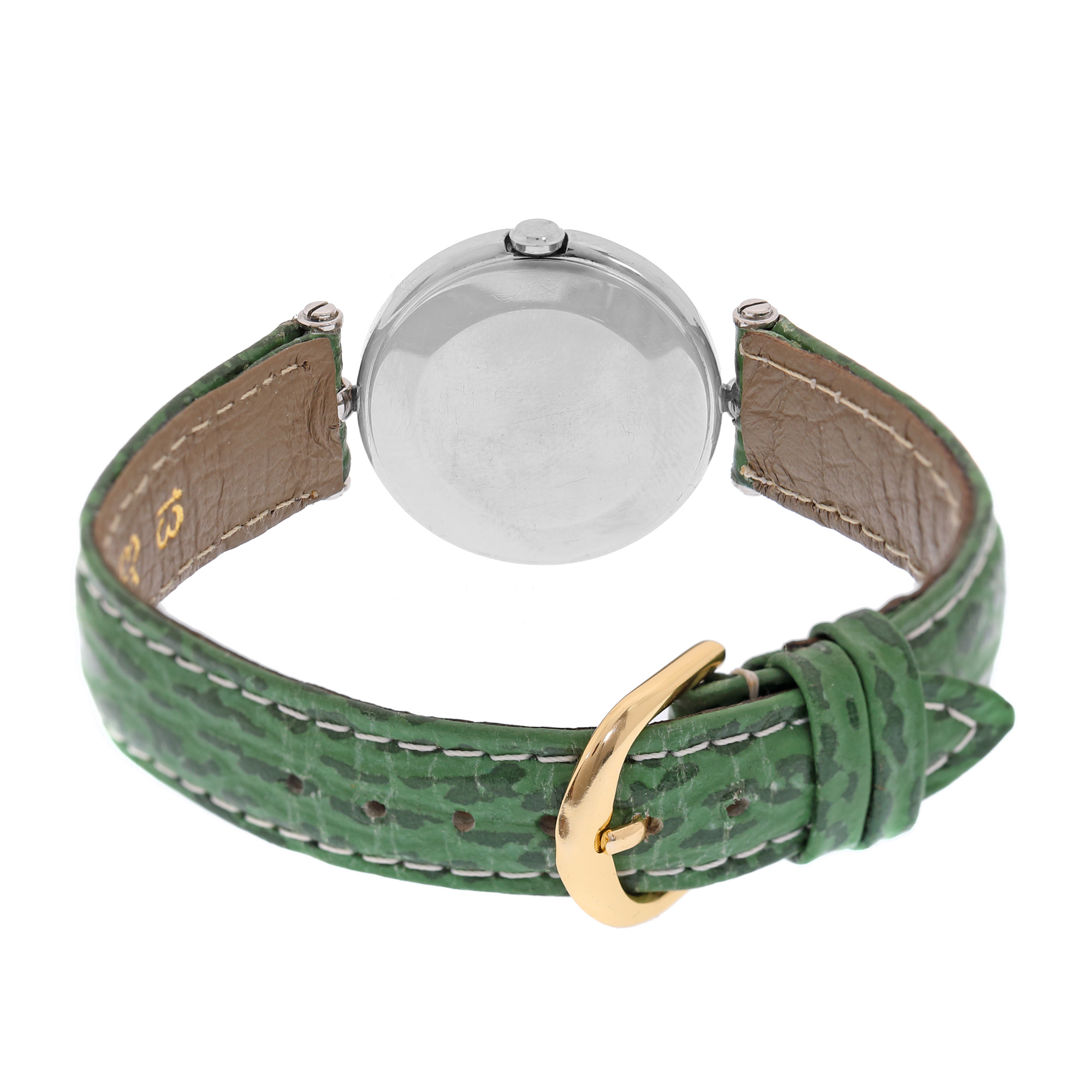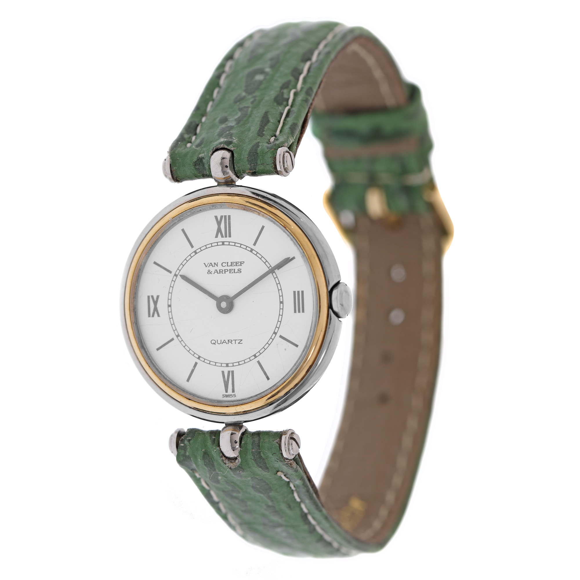 Ceas Van Cleef & Arpels La Collection, de mână, de damă, însoțit de cardul de garanție, referință 45.604/05. Mecanism quartz. Cadran de culoare alb, indici numerale romane pentru orele 3, 6, 9 și 12, baghete pentru restul orelor. Bezel aurit. Curea adăugată aftermarket, din piele, de culoare verde. Accesorii: card de garanție.