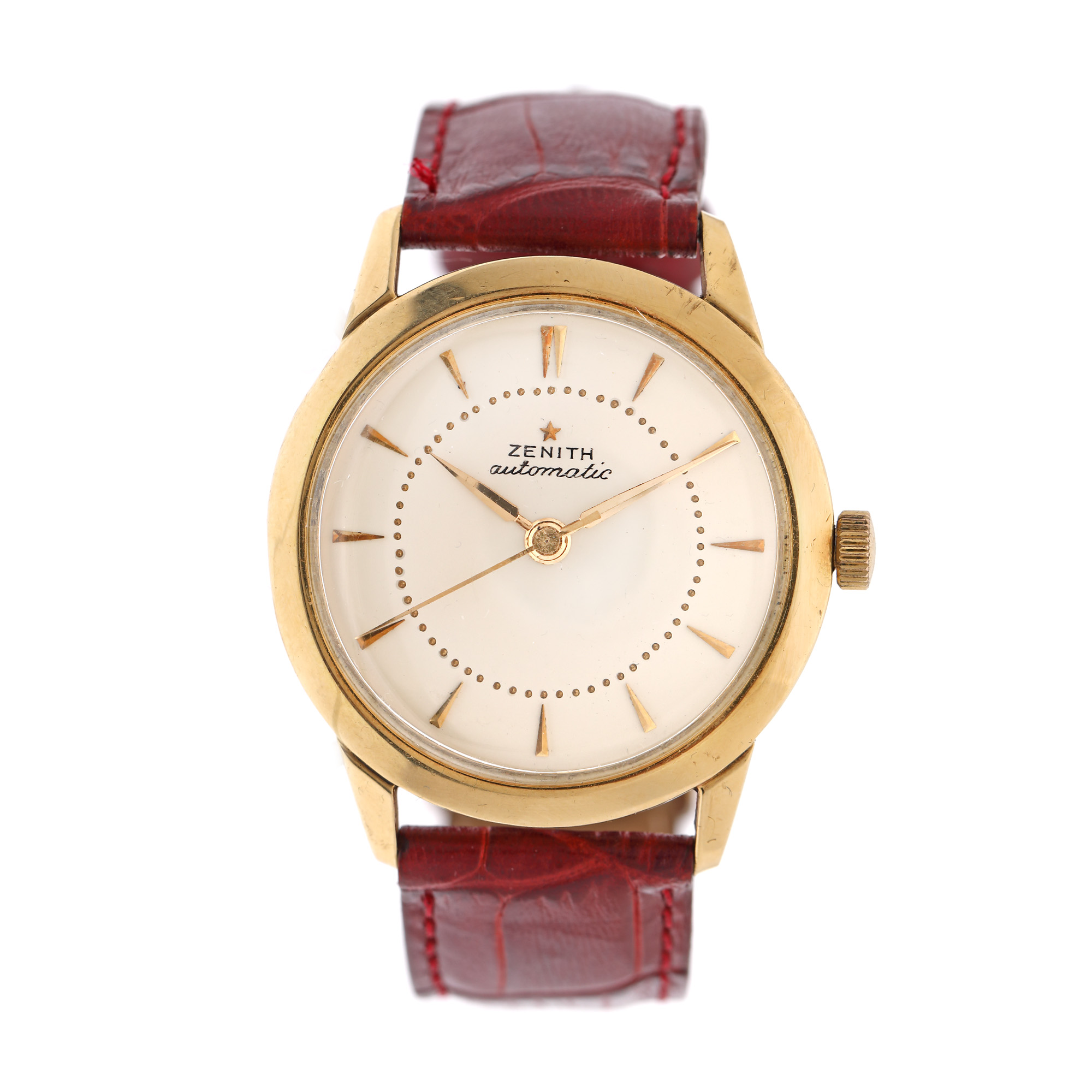 Ceas Zenith, din aur, de mână, bărbătesc. Mecanism automatic, calibrul 133. Cadran de culoare auriu, prezintă reparații ulterioare, indici săgeți. Curea adăugată aftermarket, din piele, de culoare bordeaux, cu sistem de închidere clasic.