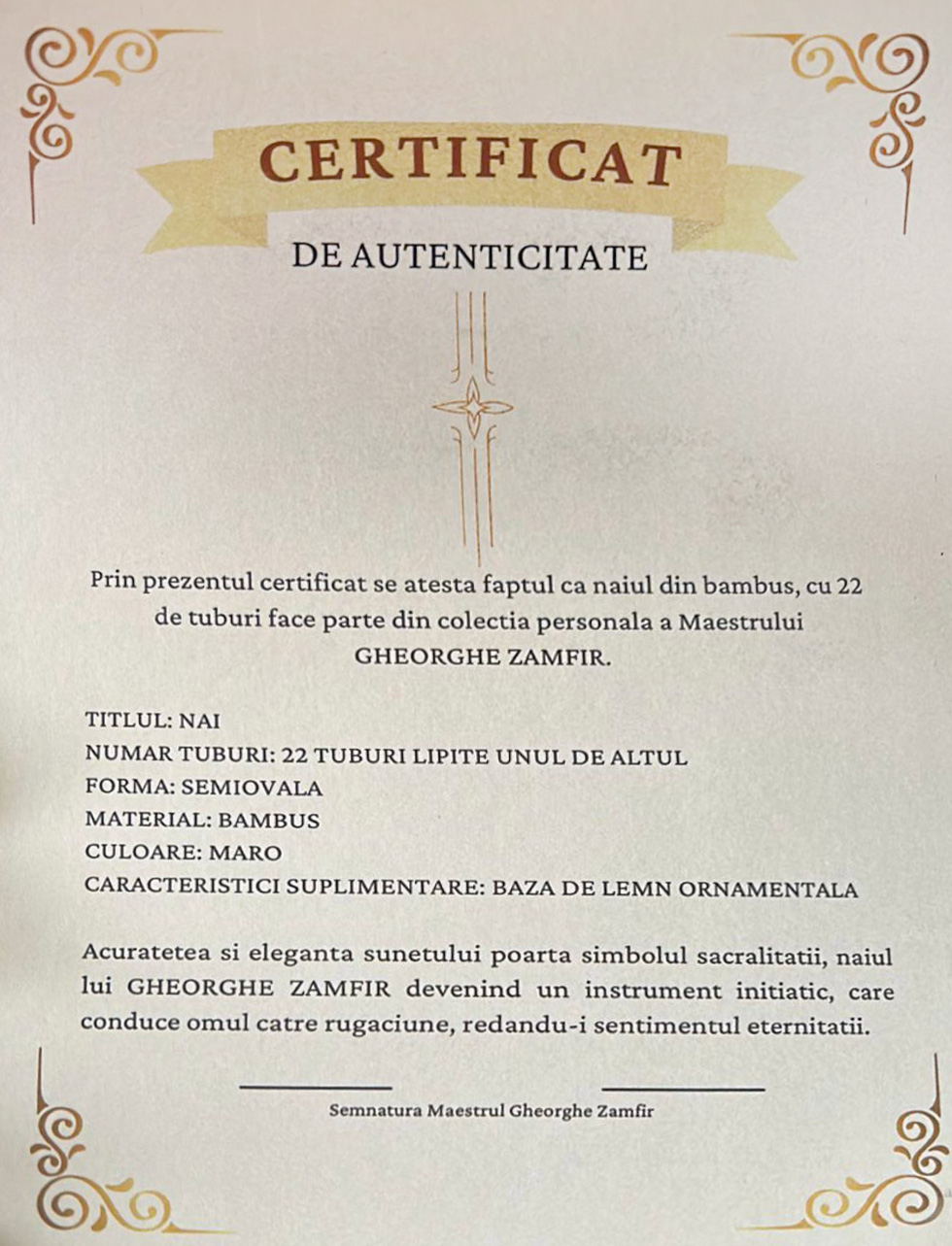 142. Naiul din bambus, cu 22 de tuburi, al maestrului Gheorghe Zamfir, însoțit de certificat de autenticitate