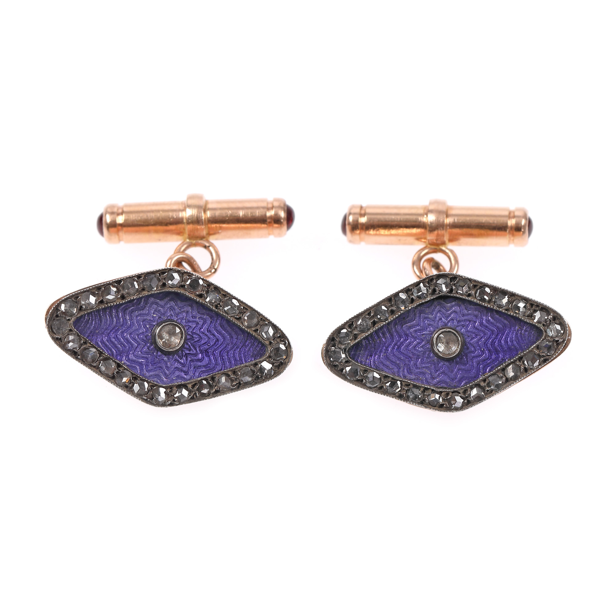 138. Pereche de butoni din aur roșu și argint, decorată cu diamante și email, începutul sec. XX