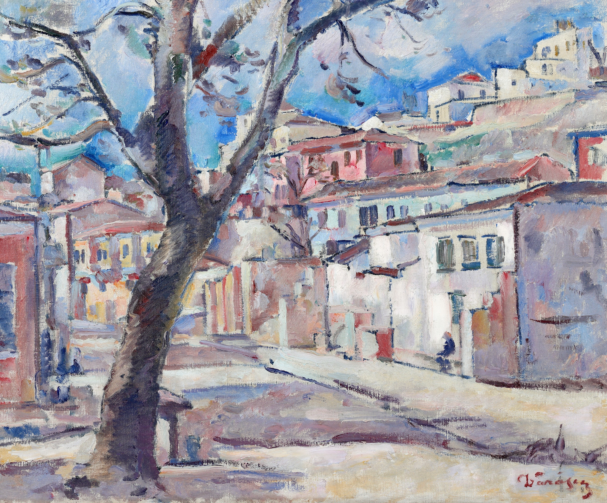 După un lung șir de călătorii efectuate de-a lungul Europei, călătorii ce au fost transpuse, inevitabil, în motive picturale, artistul va poposi în 1919 în Dobrogea. Descoperă Balcicul și dezvoltă o reală pasiune pentru culoarea acestuia. Pictează scene de gen în care îl preocupă redarea grupurilor de oameni, hanurile ori mahalalele. La expoziția personală organizată în anul 1924 prezintă mai multe lucrări care au drept punct de pornire Marea Neagră, cu stâncile incandescente și dealurile roșiatice, casele tătărești și cerurile azurii. Dărăscu va reuși să împrumute operei sale din spiritul său solar, prin vibrația tonurilor și rigoarea tehnicii care răzbate dincolo de drumurile prăfuite ale Dobrogei și ale Balcicului. Deși creația sa abundă în peisaje dedicate naturii, descoperim uneori și fragmente consacrate spațiului citadin. Menționăm aici peisajul de pe Calea Victoriei, în care artistul surprinde răceala ploii în tușele care marchează picăturile de apă; ori multiplele peisaje citadine realizate în decursul șederii la Curtea de Argeș. În aceste lucrări predomină arhitectura urbană, clădirile înalte și forfotul urbei. În opera de față, distingem arhitectura specific dobrogeană, în care clădirile se înlănțuie succesiv și deschid drumul urbei. Tușele sigure și contururile hașurate ne dezvăluie o etapă mai târzie a creației sale, o etapă în care pointilismul a fost de mult abandonat. Artistul utilizează, de asemenea, o cromatică mult mai fadă, care își deschide tonalitatea în concordanță cu peisajul reprezentat.