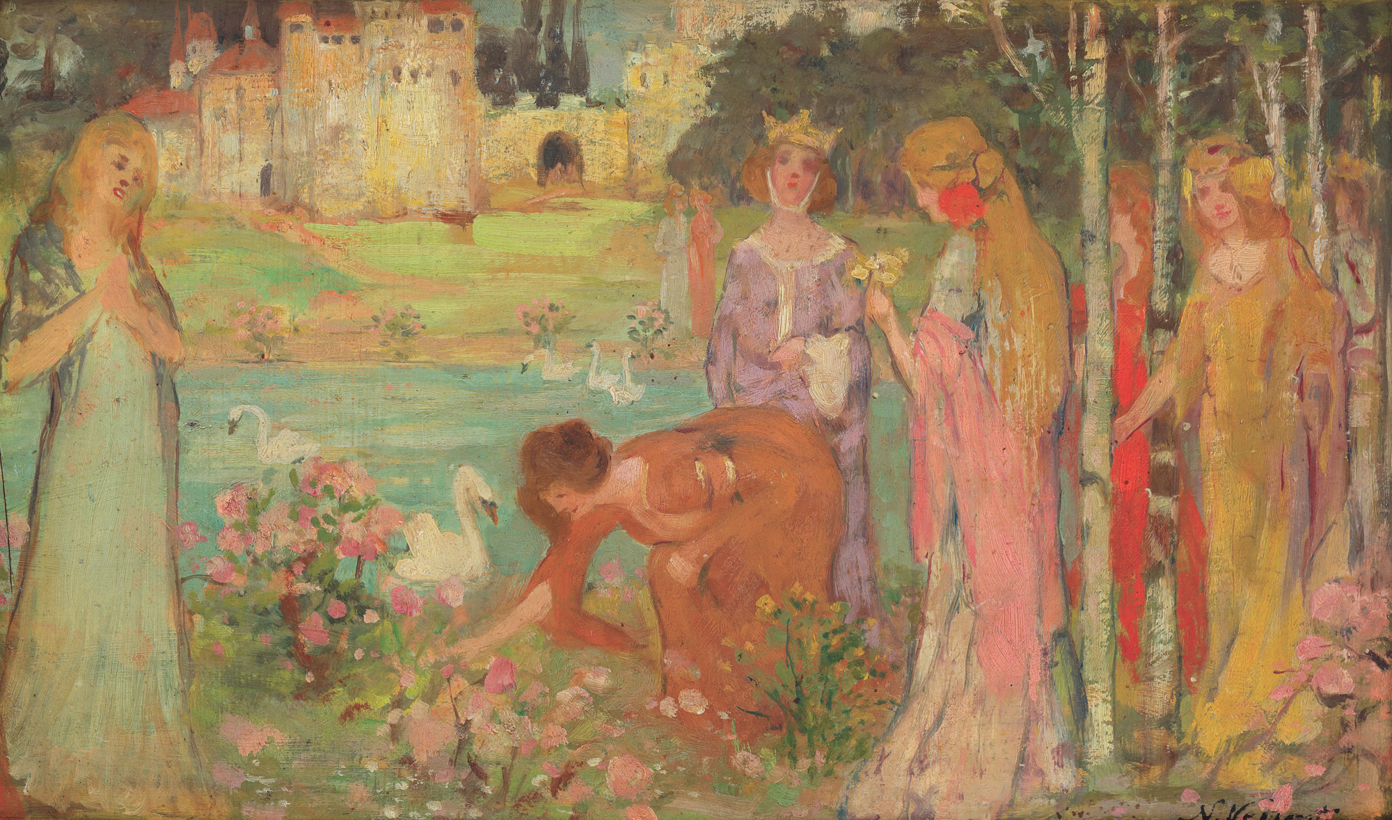 Compozițiile lui Nicolae Vermont au avut în primă instanță un caracter religios. În anul 1893 artistul expunea lucrarea ”Drumul la Golgota” în cadrul asociației Cercul Artistic. Motivele biblice au continuat să apară în opera lui Vermont în opere precum ”Suzana la baie”, ”Lapidarea Sf. Ștefan” sau ”Învierea fiicei lui Iair”. Vom resimți așadar influența școlii müncheneze și apetența pentru istorisirile biblice. Vom remarca deopotrivă încercarea de a replica dramatismul propus de Rembrandt, al cărui admirator avid era artistul român. Va începe însă să își îndrepte atenția și către compozițiile alegorice, preluând legende precum cea a lui Bachus. Anul 1907 îi conferă misiunea de a decora cu picturile sale diverse încăperi ale palatului Cantacuzino, având drept inspirație istoria acestei familiii. Nicolae Vermont va abandona tonul declamator promovat de alți colegi de generație și nu se va supune grandilocvenței artistice. Va continua să realizeze o pictură decorativă pentru diverse case boierești, invocând cel mai adesea scene mitologice în care predominau nuanțele de roz și liliachiu. Aceeași paletă cromatică se va extinde și către opera de față, care prezintă o scenă de basm, cu fiice de împărat îmbrăcate în rochii lungi, distinse; cu plete aurii care se revarsă în voie peste umerii domnițelor. Cadrul feeric e brăzdat de cromatica pastelată, în care rozuri, oranj, liliachiu, bleu, verde sau ocru se succed neîntrerupt. Remarcăm lebedele care-și croiesc drum pe lac și castelul care se întrezărește în fundalul operei; dar și pădurea care înconjoară curgerea apei, trandafirii și florile sălbatice culese de protagoniste. Unele dintre muzele lui Vermont își poartă florile în păr, în timp ce un personaj aparte se distinge prin coroana impunătoare care-i împodobește părul. Scena, desprinsă chiar din basmul ”Cele douăsprezece fete de împărat”, a fost intens reprezentată în epocă de artiștii vremii. Regăsim instantanee ce redau fermecătorul cadru și la Kimon Loghi sau Ștefan Popescu. Firul narativ, specific lui Petre Ispirescu, ne introduce într-un univers plin de speranță, perseverență și iubire.