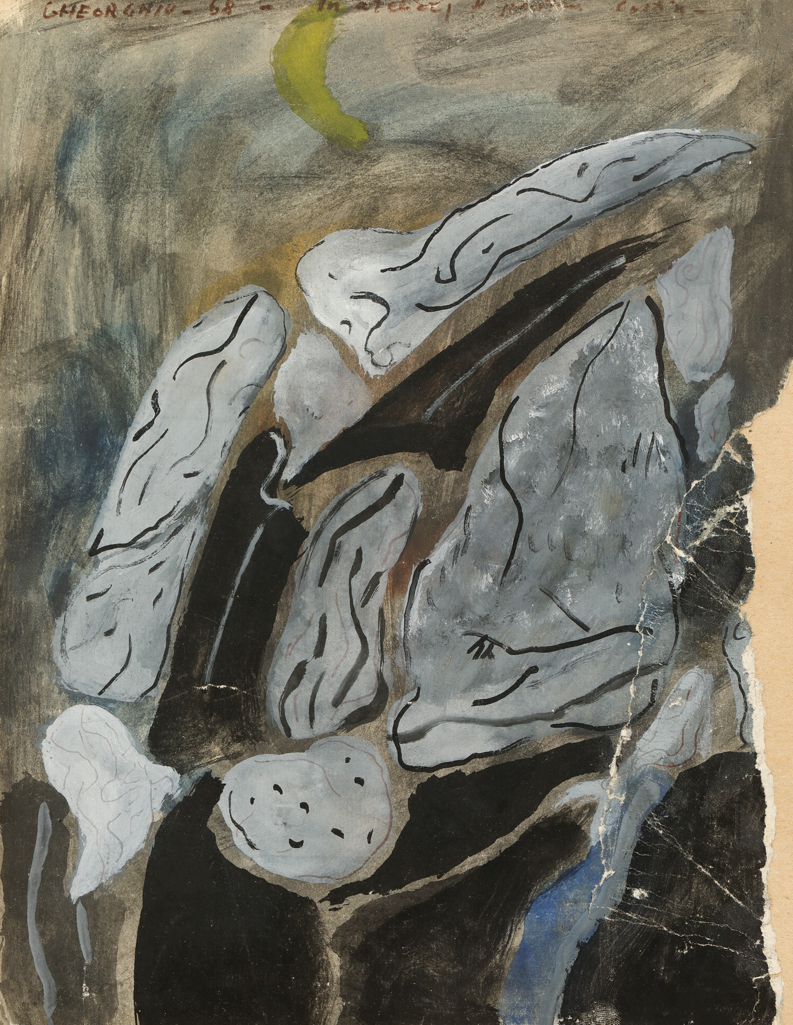 acuarelă, creion și guașă pe hârtie lipită pe carton