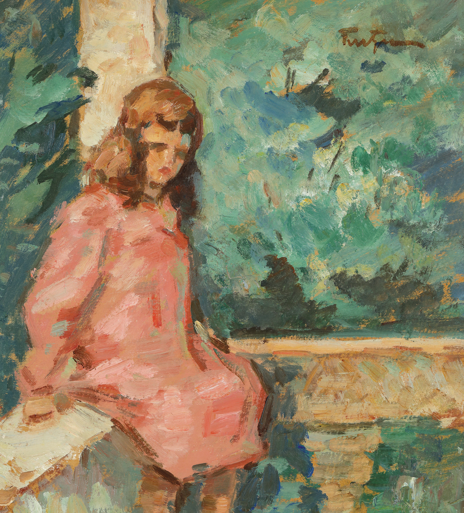 Maestru desăvârșit al portretelor de copii, Nicolae Tonitza pătrunde în sufletul micilor sale modele și reușește cu iscusință să le expună întregul univers lăuntric în opera sa. Creația lui e încărcată de sentimentul patern care îi va domina alegerile picturale. Astfel, principalul izvor de inspirație creativă vor fi chiar cei trei copiii ai săi. Reușește, printr-un exercițiu al cărui punct inițial coincide cu nașterea primului copil și care se continuă pe întreaga durată a maturizării tuturor copiilor săi, să surprindă un întreg carusel al vârstelor și întreg tumultul sufletesc ce acoperă fiecare perioadă de maturizare în parte. La Tonitza, copiii apar, după cum el însuși afirma, ”cu fermecătoarea lor inexperiență, cu armonioasa lor dezordine, cu înaripata lor nedisciplină”. Artistul acordă o atenție deosebită subiectului începând cu anii ‘20, când va începe să se concentreze mai mult pe realizarea unei incursiuni meditative în tema copilăriei. Momentul coincide cu stabilirea sa la Vălenii de Munte, după cum pictorul însuși îi relata bunului său prieten, Ștefan Dimitrescu, într-o misivă expediată la data de 5 august 1921. Se stabilise acolo alături de soția ”Titina” (Ecaterina Tonitza), fratele, sora și cei 3 copii ai săi; nepoatele sale Ticuleana și Nineta (Nineta Gusti); Țuca, fiica colegului și prietenului său pictor la rându-i, Gheorghe Zamphiropol-Dall; și Ionel, fiul colegului lui său, arhitectul Dimitrie Mohor. Casa de la Vălenii de Munte era înconjurată de o grădină generoasă, în care copiii se puteau juca în voie în livadă, iar adulții aveau datoria să se îngrijească, totodată, și de multele animale care viețuiau pe lângă gospodărie. Nu va fi de mirare, așadar, faptul că printre micile sale muze feminine le regăsim pe Catrina și pe Irina, fiicele sale; sau pe Nineta, nepoata sa. Vârsta preșcolară e acoperită mai cu seamă de portrete feminine. Tonitza le atribuie micilor muze diverse elemente decorative: fundițe, bonete, baticuri sau rochițe pe care le studiază atent și le detaliază amănunțit în operele sale. Prezintă chipul drept un microcosmos asupra căruia intervine, atunci când este cazul, cu amănunte specifice și cu o luciditate ocrotitoare. În tema ludicului găsește corespondențe muzicale culorilor pe care le așează în pânzele sale. Mica muză a operei de față ar fi putut fi surprinsă chiar în cerdacul casei de la Vălenii de Munte, ”un cerdac pe cinste”, după cum îl caracteriza Tonitza în scrisoarea trimisă lui Dimitrescu în 1921. Înconjurată de vegetația roditoare care contrastează cu rochița sa roz, protagonista lui Tonitza se desprinde din tușele viscerale ale desenului preliminar, pe care îl regăsim în colecția Bibliotecii Academiei Române, și se contopește cu fundalul fecund al spațiului natural.