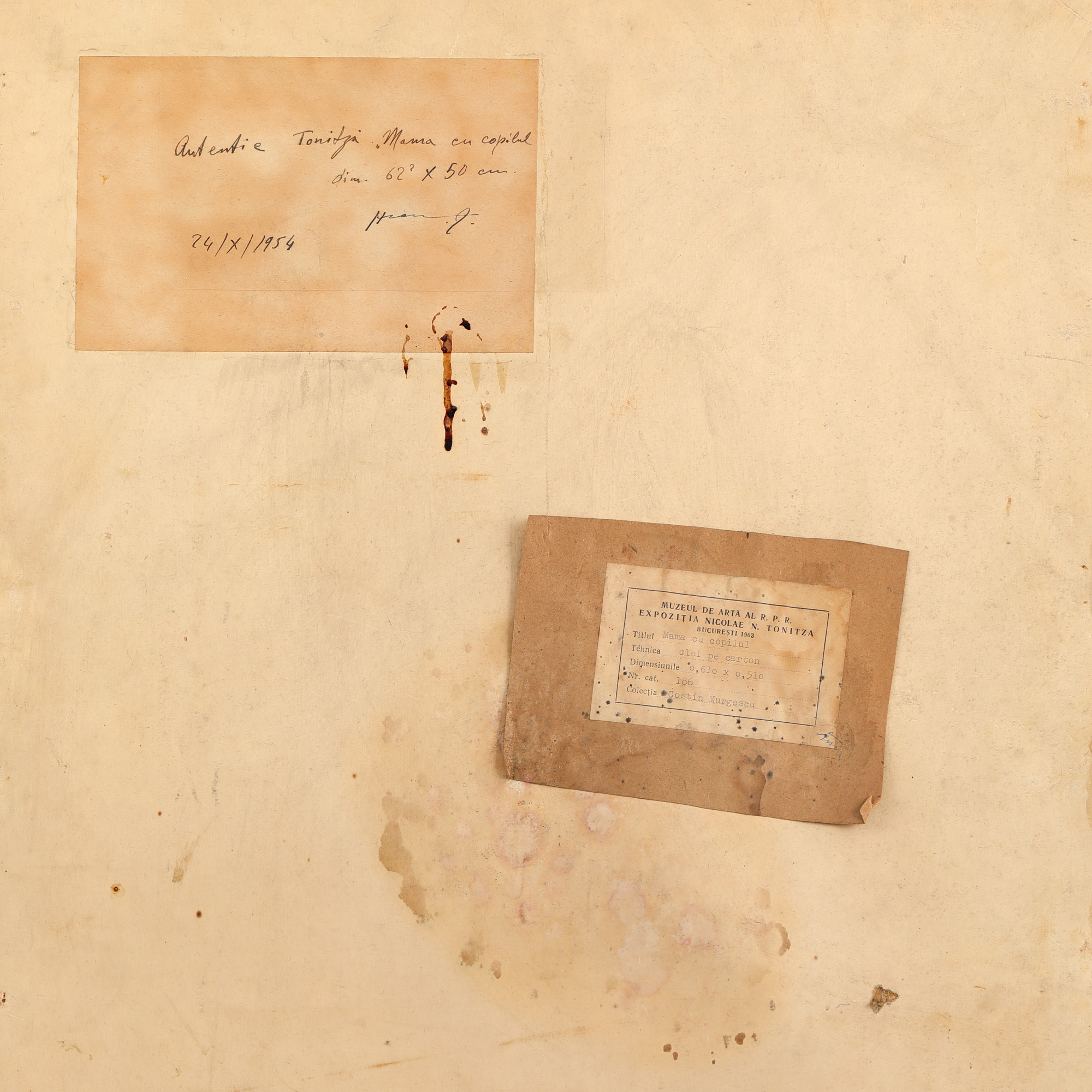 Pe verso, autentificarea: ”Autentic Tonitză ”Mama cu copilul” dim. 62 x 50. Hrandt A. 24/X/1954.”
