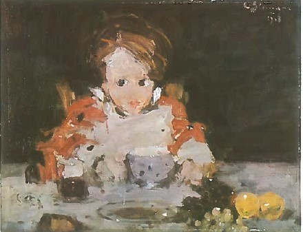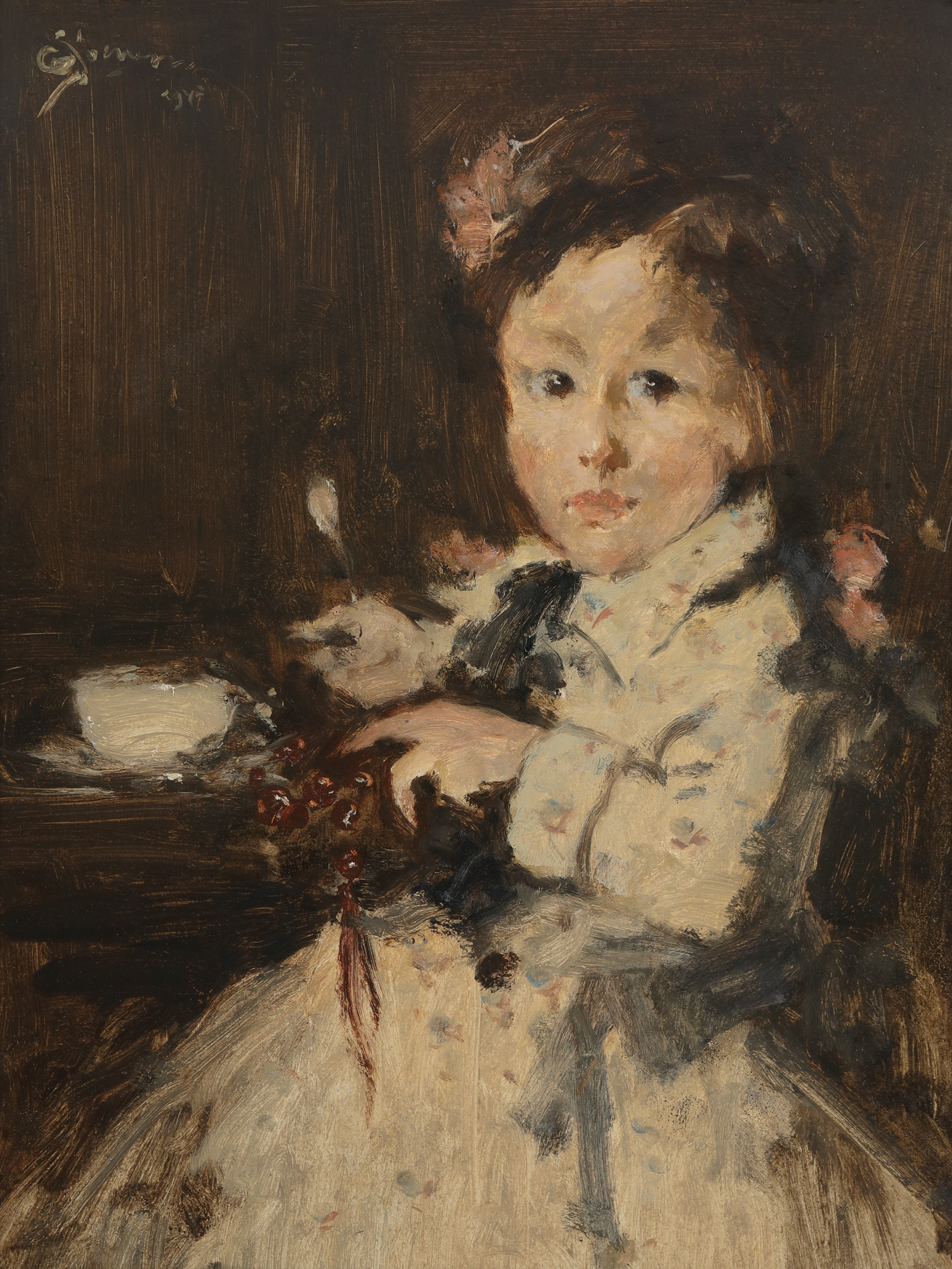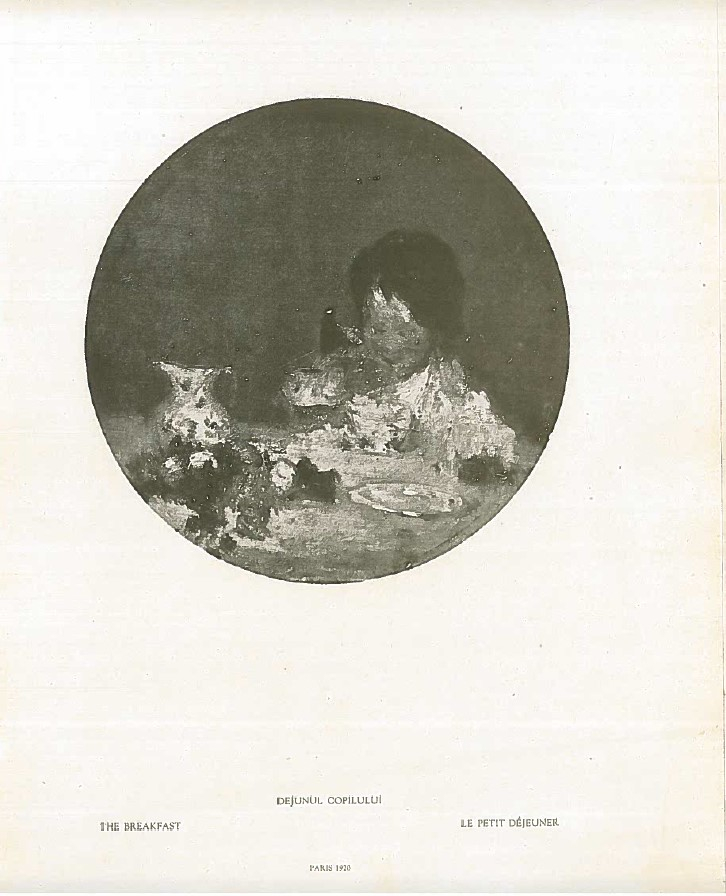Eustațiu Stoenescu urma drumul Parisului la doar 16 ani, atunci când trecea pragul Academiei Julian. Avea să studieze apoi sub îndrumarea profesorului Jean-Paul Laurens, datorită căruia va intra în contact cu alți artiști notabili ai vremii: Rodin, Bourdelle sau Albert Besnard. Stoenescu a fost, așadar, un artist precoce. Deplasarea internațională pentru studii l-a adus mai aproape de arta lui Velázquez, Rembrandt sau Whistler, artiști pe care îi admiră foarte mult. Tematica operei de față este una recurentă în creația lui Stoenescu. O primă mențiune cu privire la subiect o regăsim în cadrul Salonului din Paris organizat în anul 1914, atunci când pictorul prezintă opera ”Le déjeuner”, pentru care îi va fi înmânată Medalia de Argint. Aflat astăzi în colecția Muzeului Național de Artă al României, tabloul prezintă o scenă de interior, în care copilul (chiar propriul său fiu - Dan), așezat în scaunul său special, e secondat, cel mai probabil, de prezența mamei. Cele două personaje sunt situate în spatele unei mese îmbelșugate, pe care rezidă fructele, ceainicul, ceștile, paharul și vasul cu flori. Inocența și gingășia propriului fiu sunt imprimate operei încă din primele tușe așternute și se resimt încă de la prima privire ațintită asupra operei. ”Dejunul copilului”, realizată în anul 1920, prezintă același subiect redat într-o manieră apropiată. Se modifică însă desfășurarea compoziției, iar personajul apare plasat de această dată în partea dreaptă a lucrării. Motivul este reluat apoi și în ”Copil la masă” (1938), operă ce a fost numită ”o culme” a creației lui Stoenescu. Realizată deja în perioada sa de deplină maturitate artistică, lucrarea menționată anterior se remarcă prin verva și siguranța coloritului și a tușelor așternute de artist. Lumina specifică, cuprinsă direct în culoare ne divulgă personajul într-un contrast profund cu fundalul întunecat. Spectacolul dimineților va fi surprins, astfel, de pictorul român printr-o gamă cromatică preferată și un stil compozițional specific. Opera de față, ce datează din ultimul an de viață al artistului, perioadă în care s-a perindat prin mai multe țări, ne prezintă de această dată o fetiță așezată la masă, văzută din profil, având o ceșcuță de ceai în fața sa, și ținând strâns o linguriță în mâna dreaptă. Expresia candidă, ochii larg deschiși care privesc direct către pictor, ne relevă dragostea sa nemărginită pentru tematica de sorginte ludică. Delimitarea precisă a tușelor, trecerile cromatice dinspre paleta caldă, luminoasă, rezervată micii protagoniste către nuanțele întunecate ce alcătuiesc fundalul operei reiterează calitățile lui Eustațiu Stoenescu de portretist al temperamentului. Corespondentul francez al revistei Art News, nota, în 1927: ”Portretele lui Stoenescu sunt portrete ale sufletului și tot așa și peisajele sale care, conform cu expresia lui Stendhal, sunt reale ”états d'âme”.