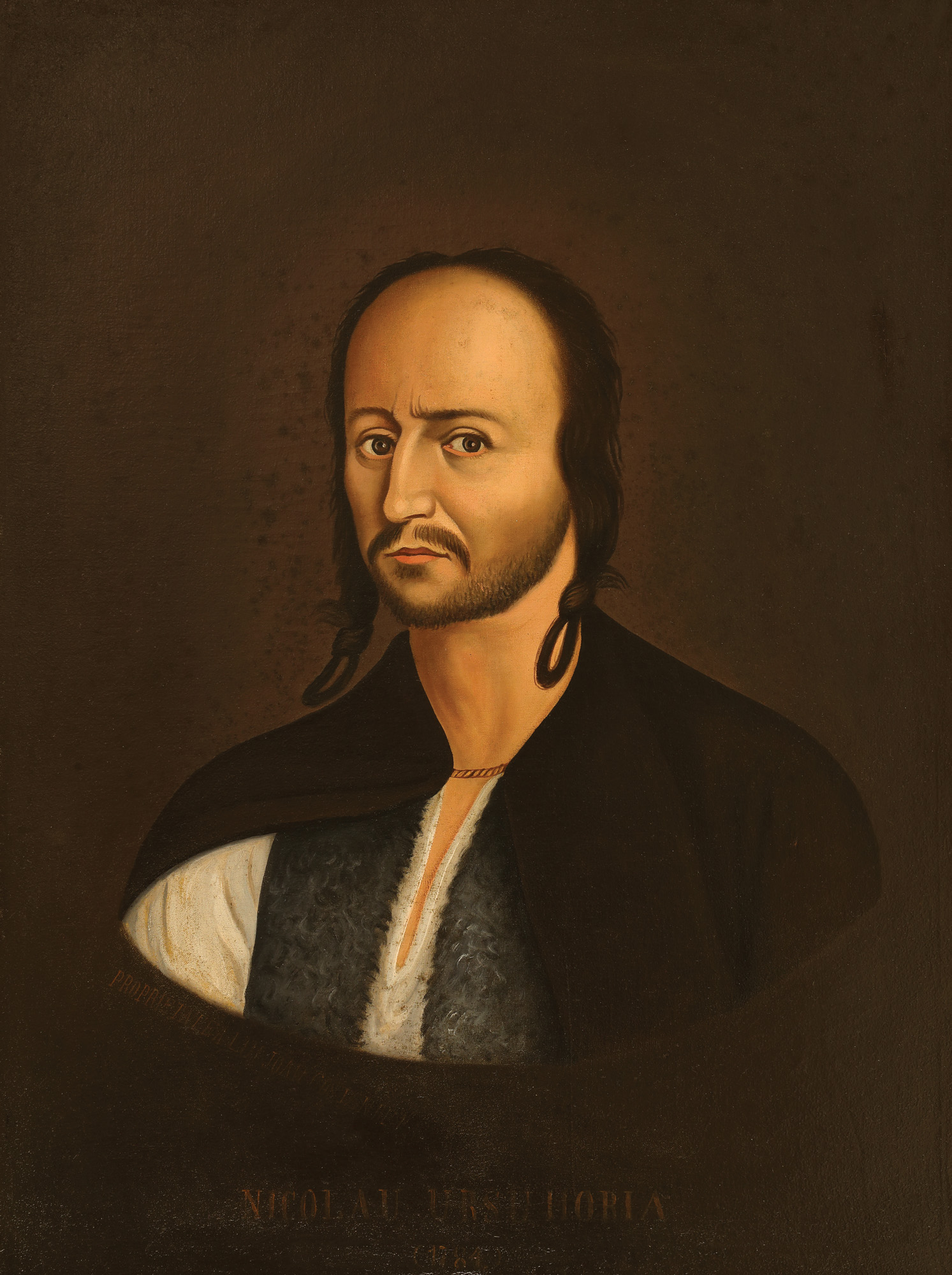 semnat lateral stânga, sub portret, cu ocru, "PROPRIETATEA LUI IOAN COSTANDE PA"; intitulat central jos, cu ocru, "NICOLAU URSU HORIA, (1784)"