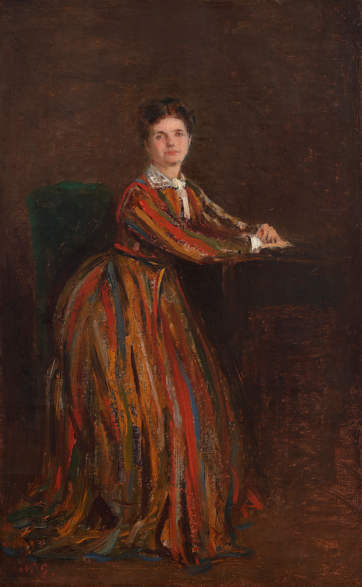 Portretul compozițional al Emiliei Dona ( ?-1890), înfățișează modelul figură întreagă, așezat pe un fotoliu și văzut din laterală, cu situarea preponderentă a personajului în zona stângă a imaginii. Proiectat pe fundalul întunecat, chipul ne privește însă din centrul imaginii, frontal, permițîndu-i lui Grigorescu să ne transmită ceea ce investigase - feminitatea delicată a trăsăturilor, căldura și melancolia privirii dar și o anume prestanță dată de impostația personajului ținându-și mâinile împreunate, pe masă. Soluția de compunere a paginii evită cu bună știință monotonia pe care ar fi putut-o da o viziune precumpănitor frontală și simetrică a modelului. La arhitectura ansamblului participă esențial nota de somptuozitate a contrastului cromatic stabilit între verdele de China (fotoliul) și culorile calde - roșu si ocruri - ale rochiei de mătase în dungi. După cum ne dezvăluie semnătura N.G., pe care artistul a utilizat-o cu certitudine în 1874 (momentul sejurului în Italia), dar se pare și în jurul acestui an, lucrarea de față a putut fi pictată în aceeași perioadă din primii ani ai deceniului 8. Este epoca în care Grigorescu a frecventat des casele familiilor înrudite îndeaproape V.A. Urechia și Dona, mediu în care preocupările intelectuale și artistice erau primordiale, iar calitatea umană apreciată. S-a stabilit astfel o relație foarte strânsă de prietenie  ce va dura cât viața protagoniștilor. Grigorescu a pictat și a desenat portretele doamnelor din aceste familii, cele patru surori Pester-Wirth (Luiza, Ana/Zettina, Carlotta, Emilia), fiicele antreprenorului ieșean Pester și ale soției acestuia, Margareta von Wirth (Vezi Mihai Sorin Rădulescu, 2007, p. 437). Cele patru surori au beneficiat de o aleasă educație muzicală, afirmându-se în concerte la București și Constanța. Carlotta - numită ca artistă de operă Carlotta Leria - a devenit soprană cunoscută și profesoară de Canto la Conservatorul din București. După cum aflăm din amintirile profesorului I. D. Ștefănescu, Emilia Dona, pe care Grigorescu a pictat-o și în alte portrete decât cel de față (păstrate în colecția dr. Iosif N. Dona), avusese parte de o formație artistică aparte, deoarece „crescuse la Paris în casa doamnei Viardot Garcia și cunoscuse pe Flaubert, Renan, Turgheniev, alături de marii muzicanți și cântăreți care frecventau casa celebrei sale protectoare” (I. D. Ștefănescu, 1957, p. 189 ; mărturie citată de Doina Păuleanu, 2010, p. 60). Emilia a fost soția generalului Nicolae Dona (1837-1915), mama medicului colecționar Iosif N. Dona (1875-1956), iar fiica sa, Margareta a fost căsătorită cu Alexandru Vlahuță. (I.B.)
