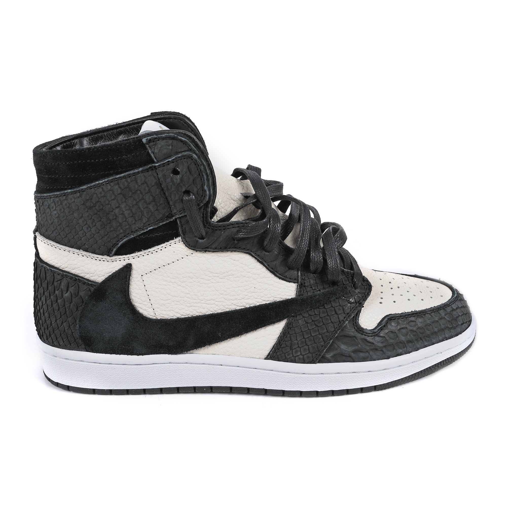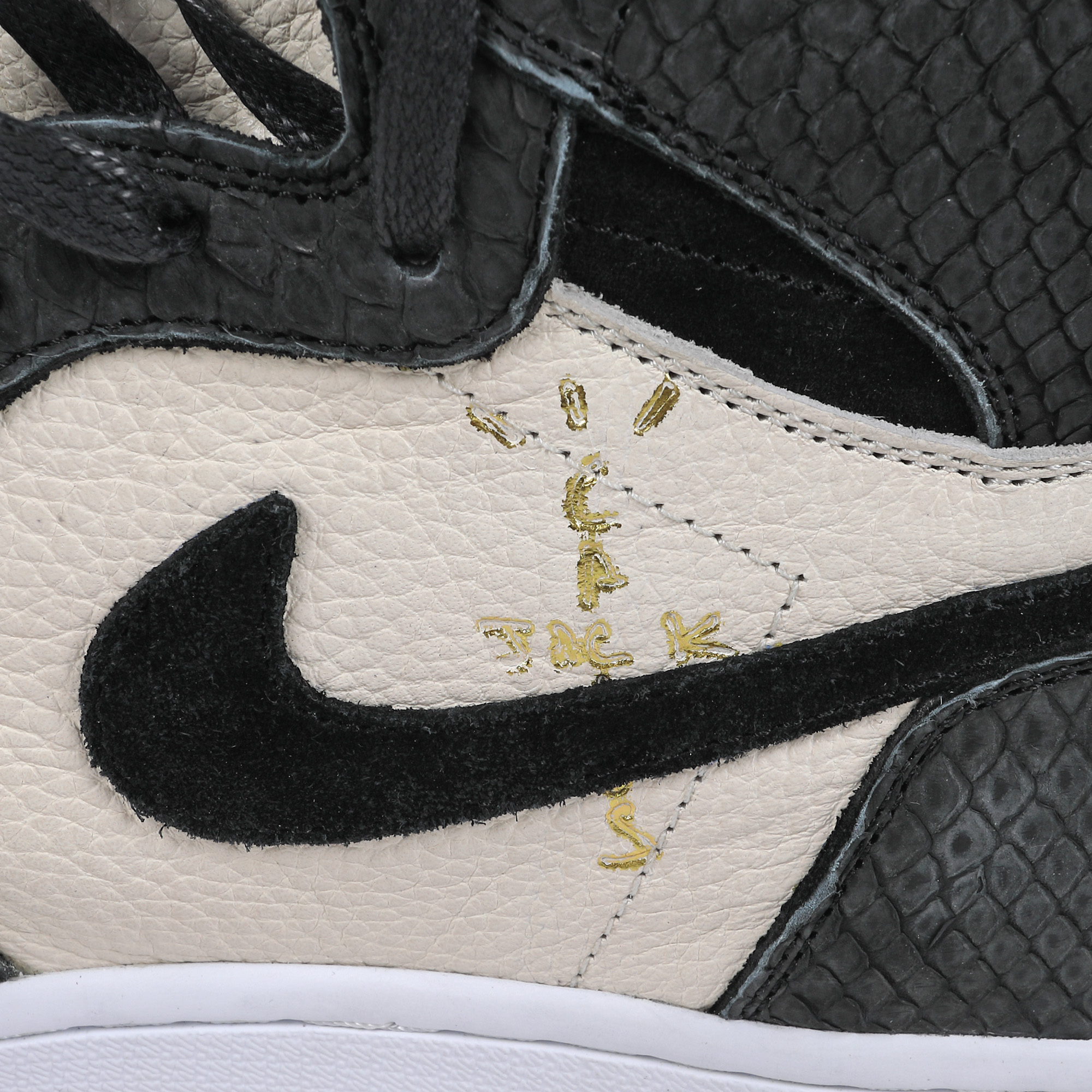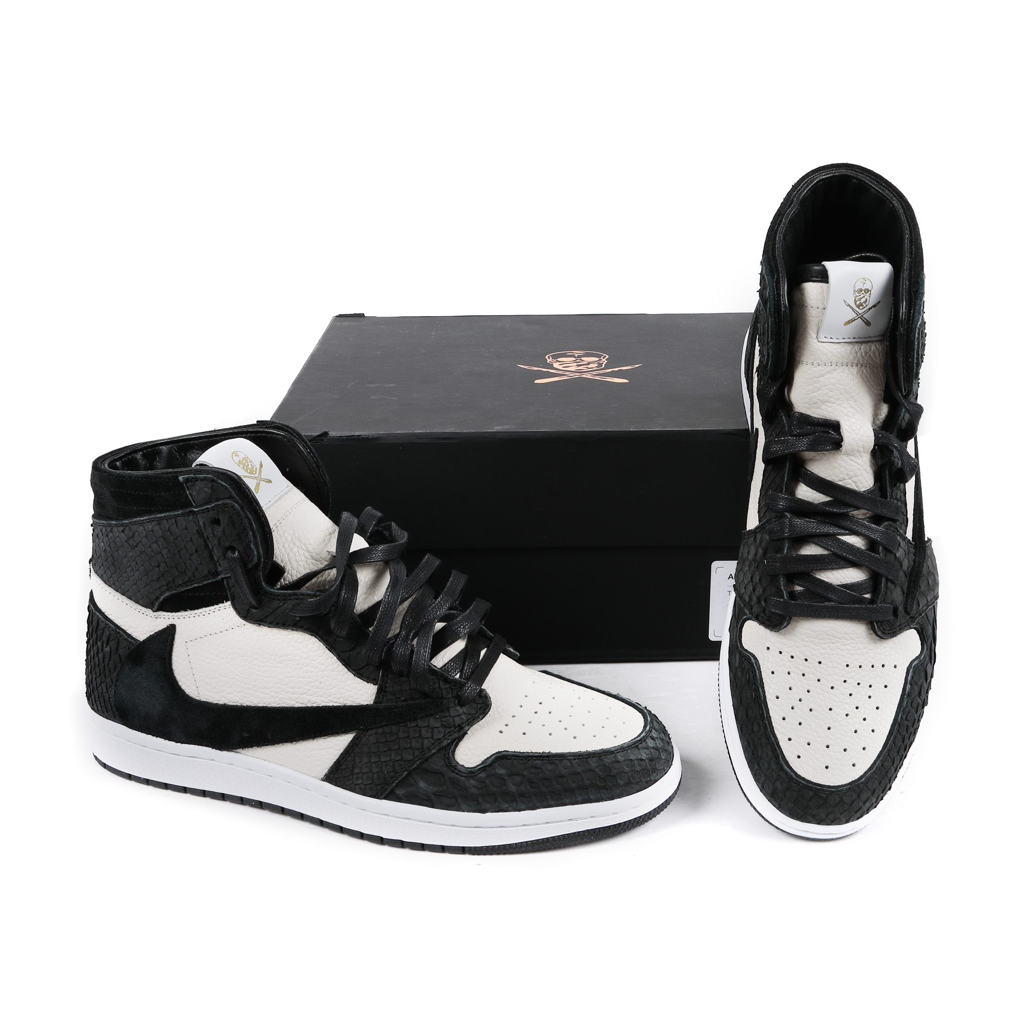 Pereche de sneakerși în ediție limitată Nike Air Jordan 1 High x Travis Scott, în colaborare cu artistul urban Dominic "Shoe Surgeon" Ciambrone. Stabilit în Los Angeles, Shoe Surgeon reconstruiește modele populare de sneakerși după viziunea sa, folosind materiale extrem de calitative, cum sunt pielea de piton sau aurul. Artistul a mai realizat colaborări și cu branduri precum Birkenstock sau Gucci. În lista selectă de clienți ai lui Shoe Surgeon se numără starul NBA Trae Young sau CEO-ul diviziei de luptă UFC, Dana White.