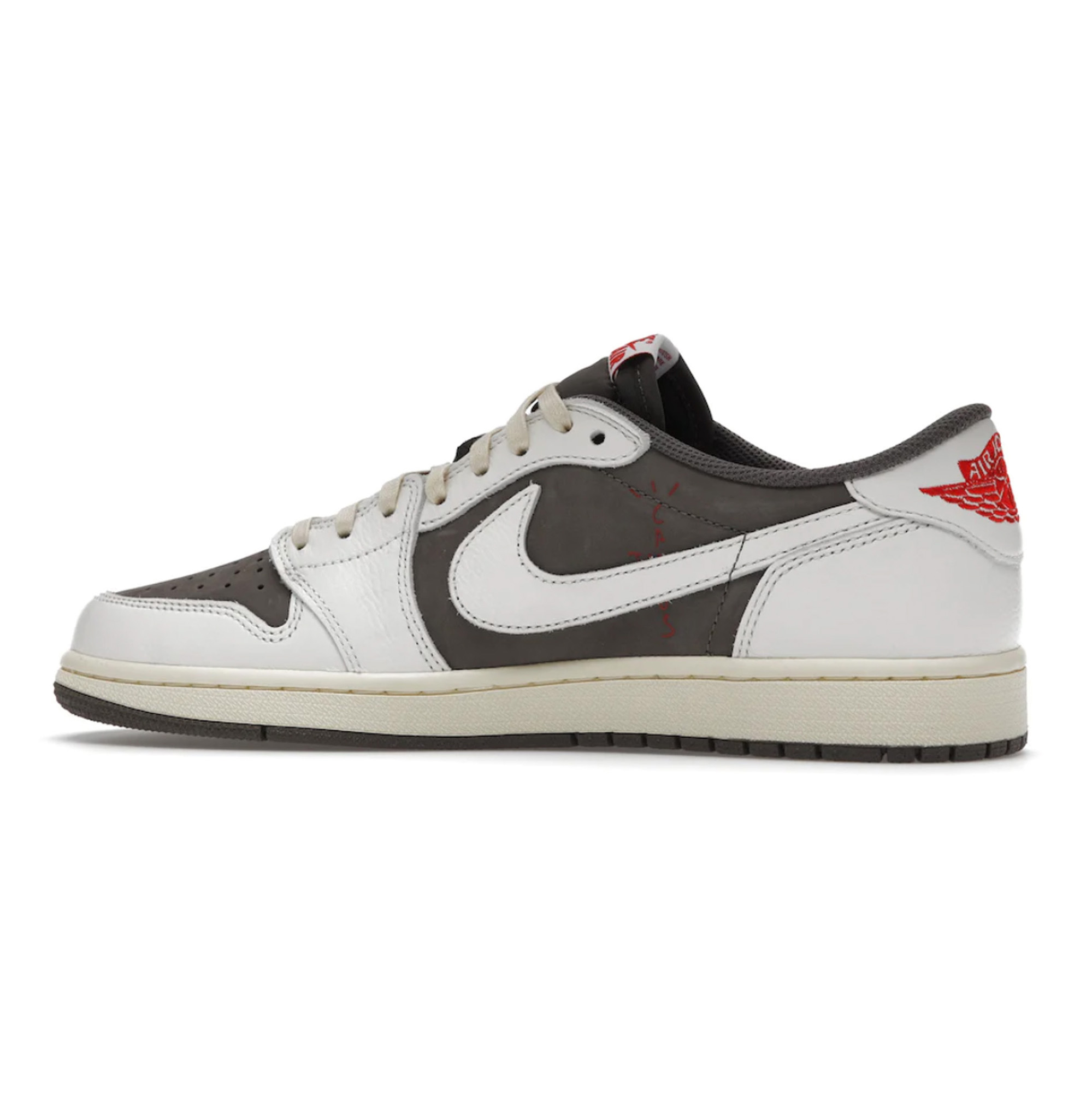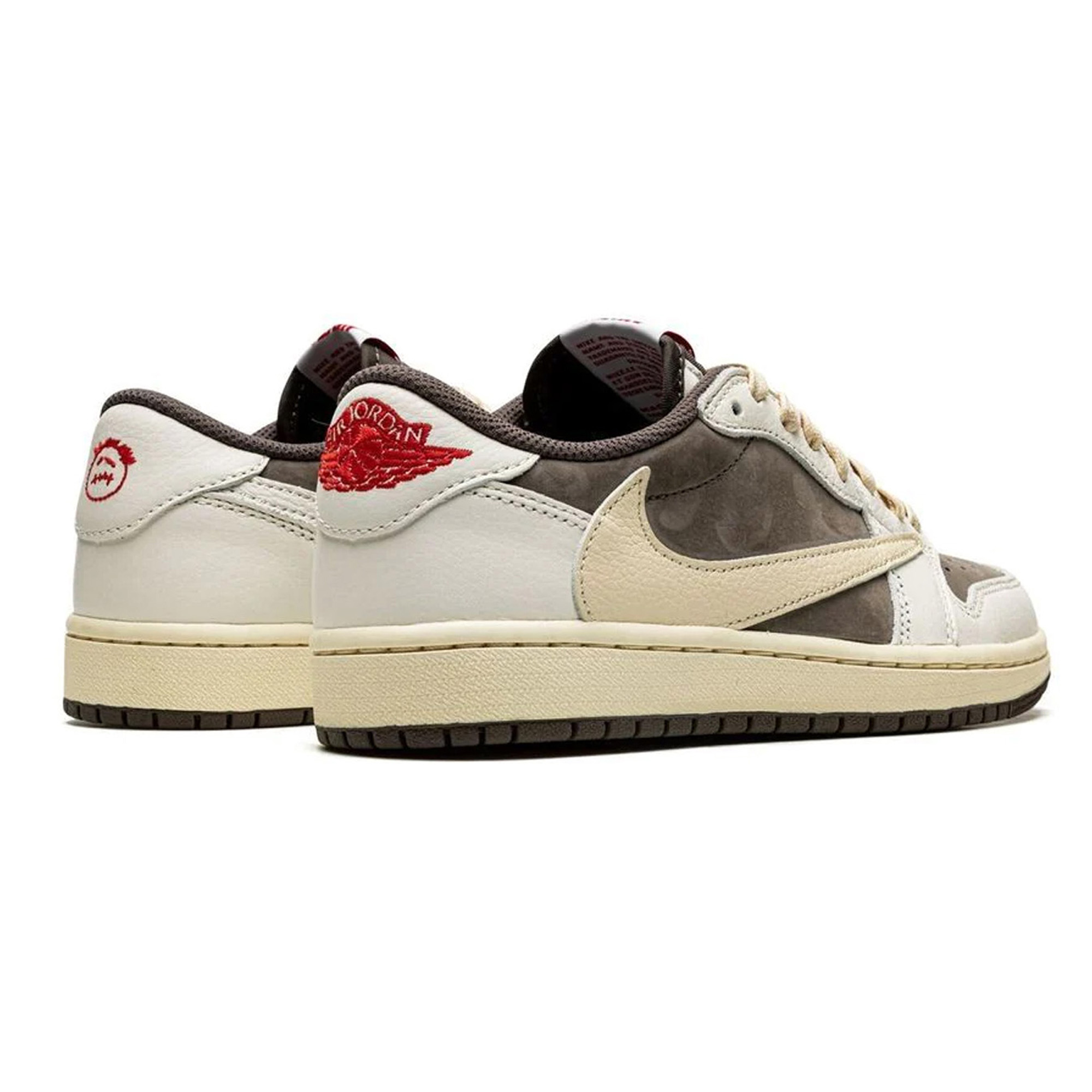 Air Jordan 1 Low Travis Scott Reverse Mocha pornește de la o paletă cromatică similară ediției Mocha, dar pe un aliniament revers. Partea superioară este construită cu o bază Mocha Durabuck, cu suprapuneri din piele albă și caracteristicile Swoosh inversate. Tonurile de roșu de pe broderia cu logo-ul Wings, aflat pe călcâi, și eticheta țesută a limbii oferă un contrast puternic cu aspectul neutru al designului. În plus, talpa Air îngălbenită adaugă o senzație vintage.