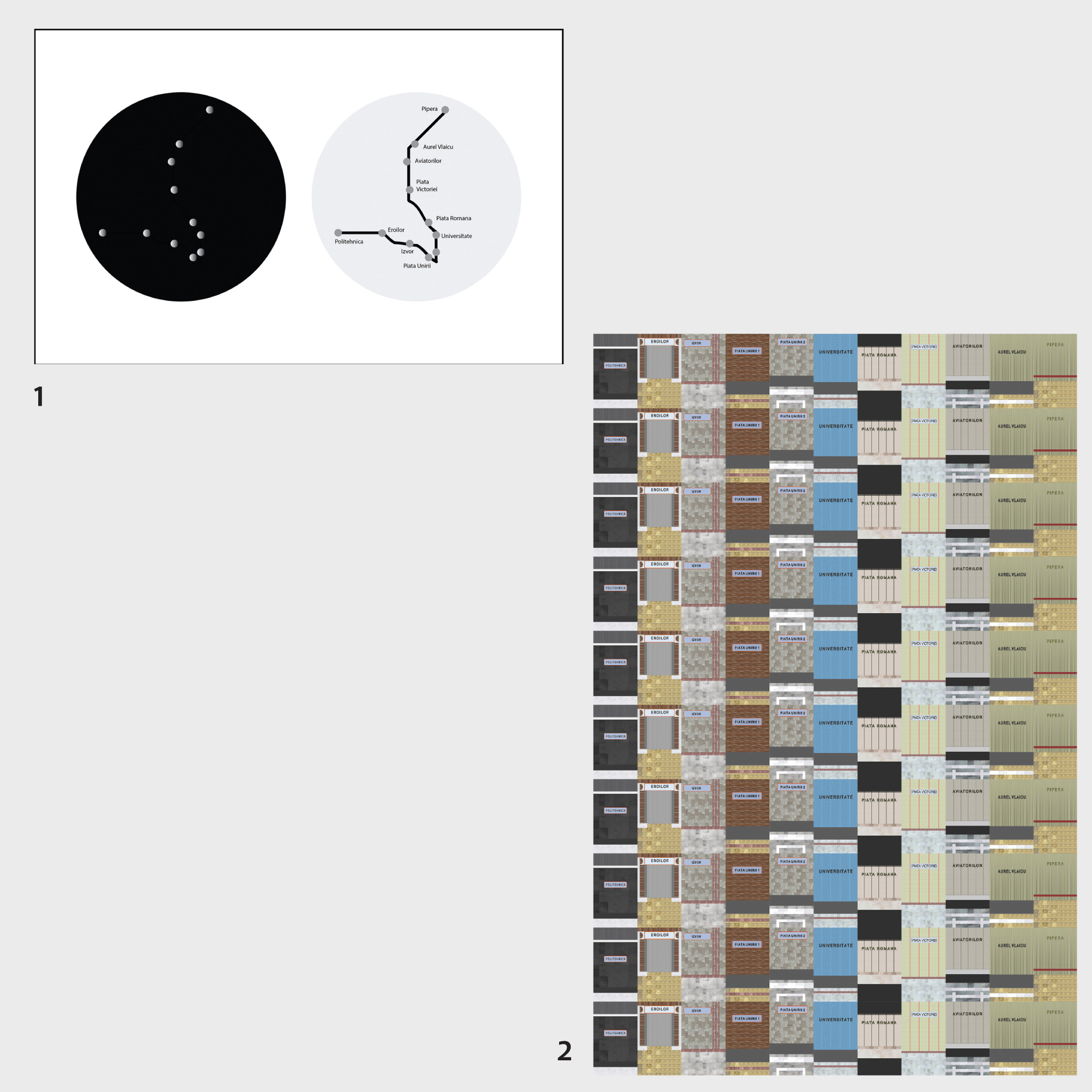 This art piece illustrates my daily route from home to work and from work to home, analyzed over a six month period. I tried to transform the subway into a pattern so I could perceive it as a less hostile environment. By removing the temporal component and ignoring the fact that the subway is now filthy and worn down, I tried to envision what it looked like when it was built. (Roberta Curcă)