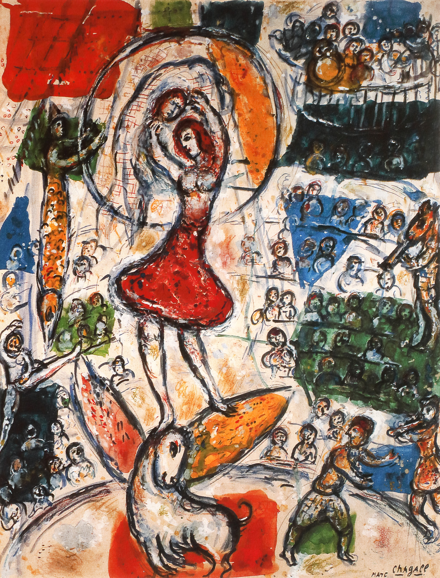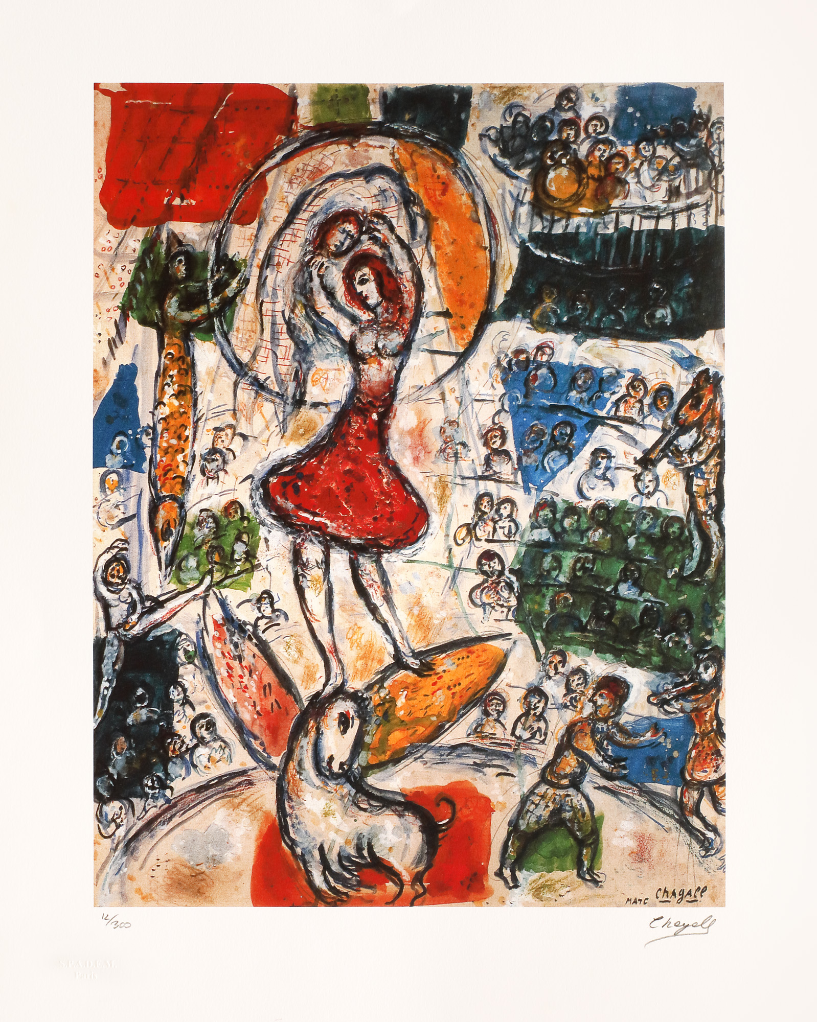 semnat dublu dreapta jos, sub cadru, ”Chagall”; numerotat stânga jos, sub cadru, ”12/300”; stânga jos, ștampila editurii, ”SPADEM Paris”
