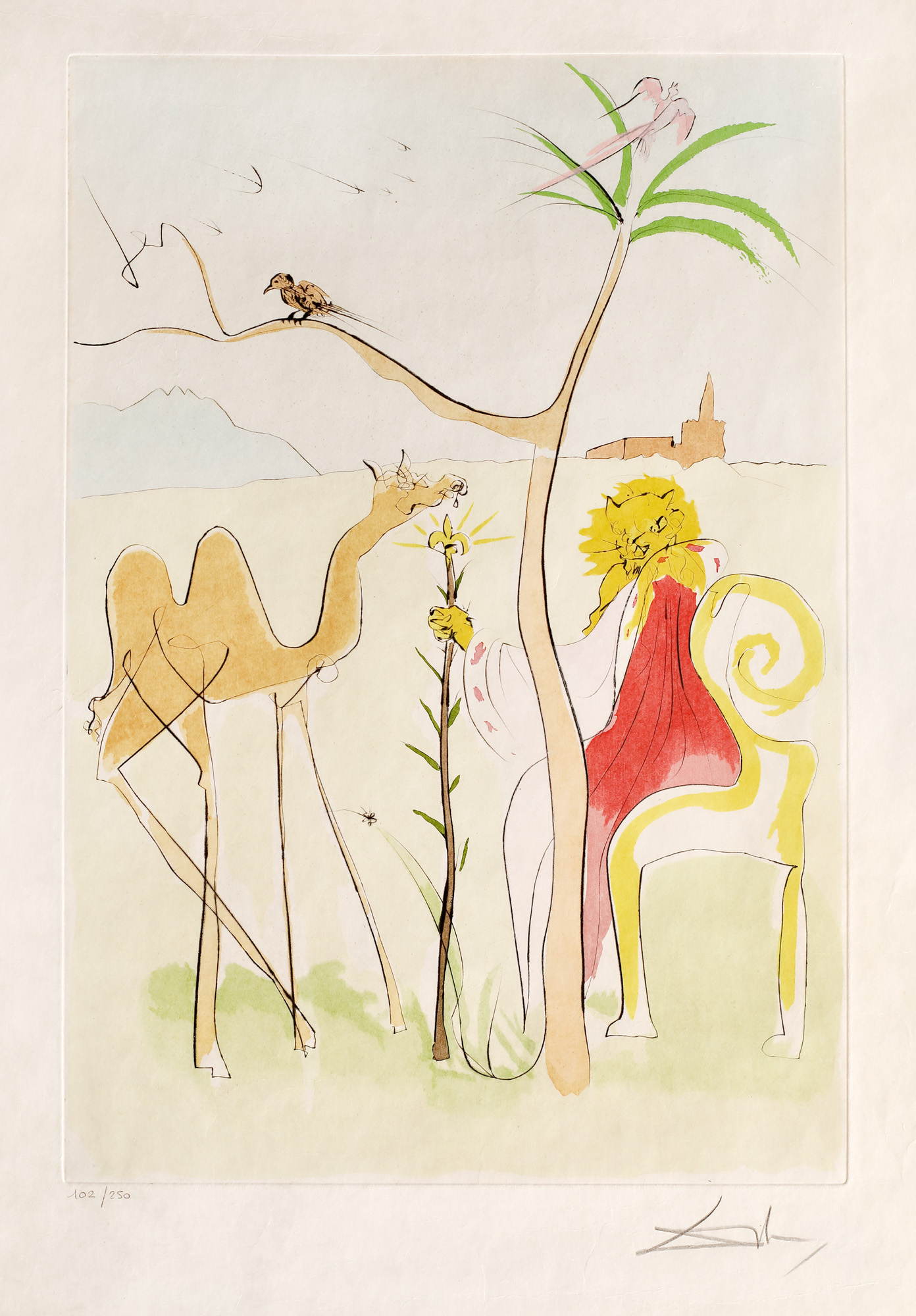 semnat dreapta jos, sub cadru, în creion, ”Dali”; numerotat stânga jos, sub cadru, în creion, ”102/250”