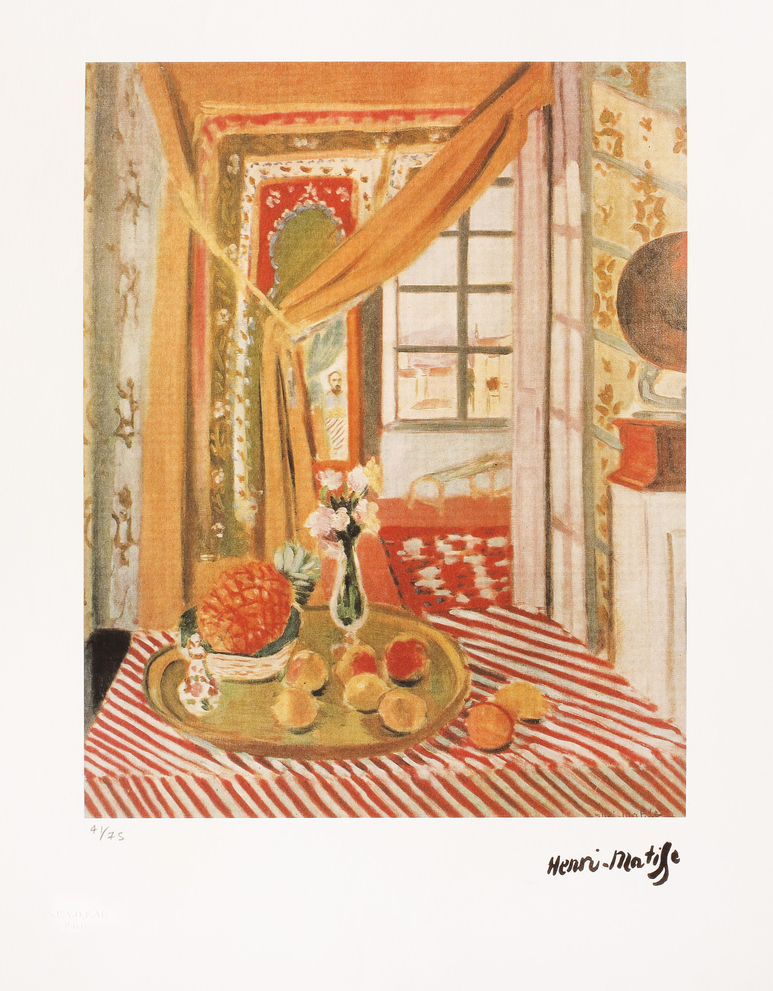 semnat dreapta jos, sub cadru, ”Henri Matisse”; numerotat stânga jos, sub cadru, în creion, ”41/75”; stânga jos, ștampila editurii, ”SPADEM Paris