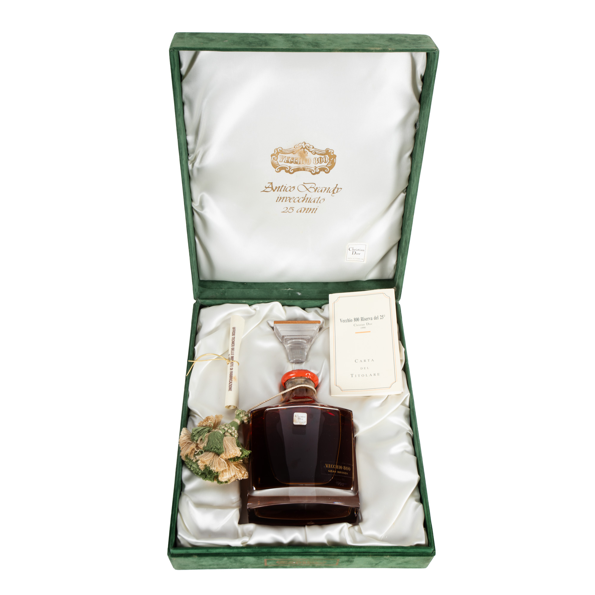 66. Brandy Vecchio 800 Riserva Del 25º, Camel, Christian Dior, 1990, 1st x 0,70l, în decantor din cristal, însoțit de certificat și cutia originală, ediție limitată