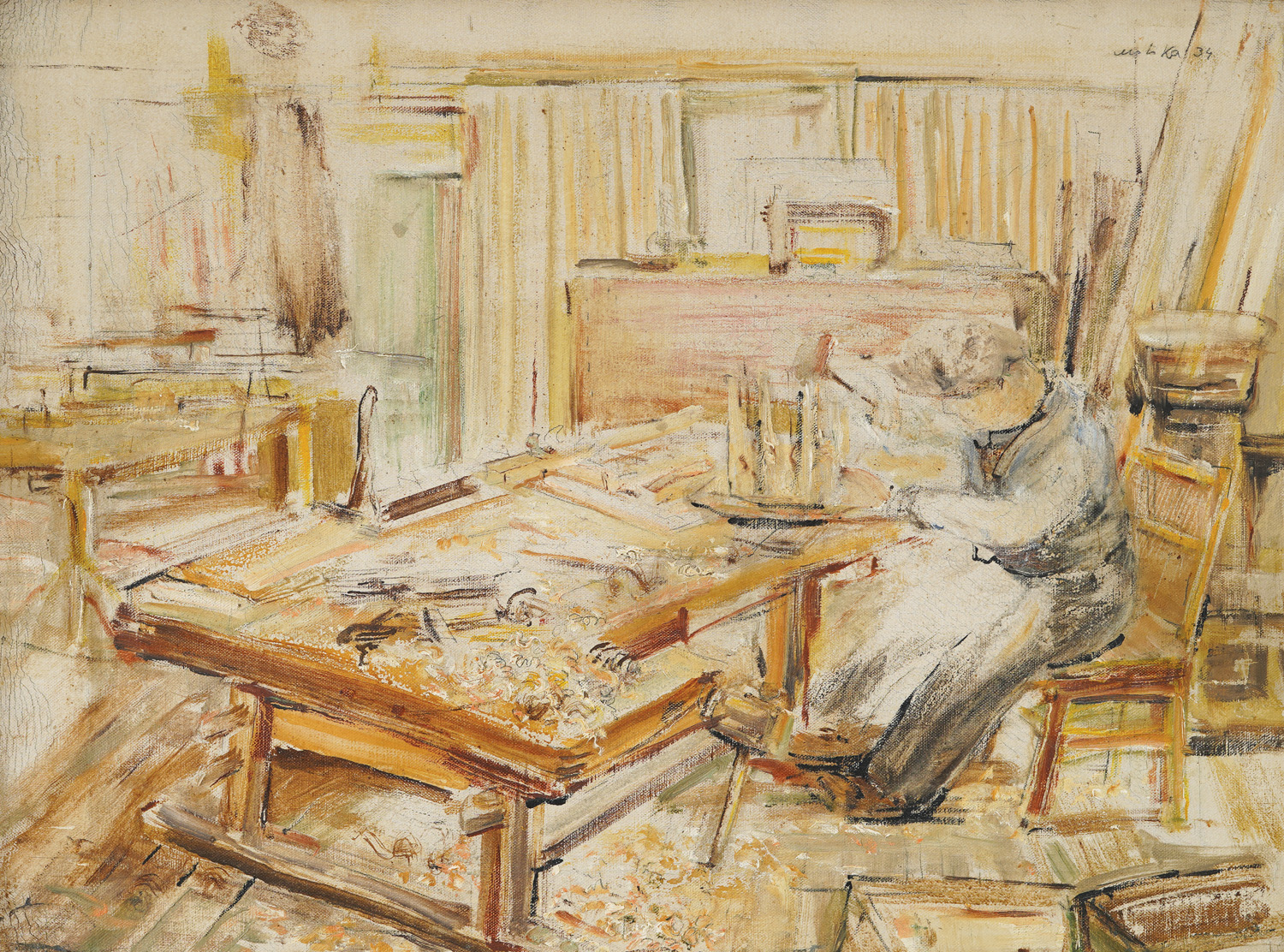 This work by a great Croatian painter and brilliant sculptor, particularly in the glass medium, belongs to the so-called Mostar period of the artist's creative period while he lived and worked in Mostar as a high school drawing professor from 1929 to 1940. It is worth pointing out that during those years Motika also studied in Paris (1930 and 1935) where he properly acquainted with contemporary style trends of the international L'École de Paris on Montmartre and Montparnasse, which left a far-reaching mark on his oeuvre. Quite a number of Motika's brilliant views of the Mostar promenade, railway station with bustling carriages in front, interiors with bouquets of flowers, Muslim women in sparkling costumes or vibrant scenes of industrious craftsmen of various trades radiate an irresistible "pure" light and impersonal lyricism of post-impressionist character that leaves few indifferent. In 1940, Motika was transferred to Zagreb, where he worked at the School of Applied Arts until his retirement in 1961, and after that he painted, experimented and created tirelessly in a wide field of visual media and material until his illness and inevitable departure. The painting "Carpenter in the Workshop", painted with subtly harmonized coloristic values, was exhibited at the painter's retrospective in the Modern Gallery held from December 1974 to January 1975 and was reproduced in the accompanying exhibition catalog (on the page without pagination) and included in the list of exhibits under catalog number 91 on p. 252. BRP