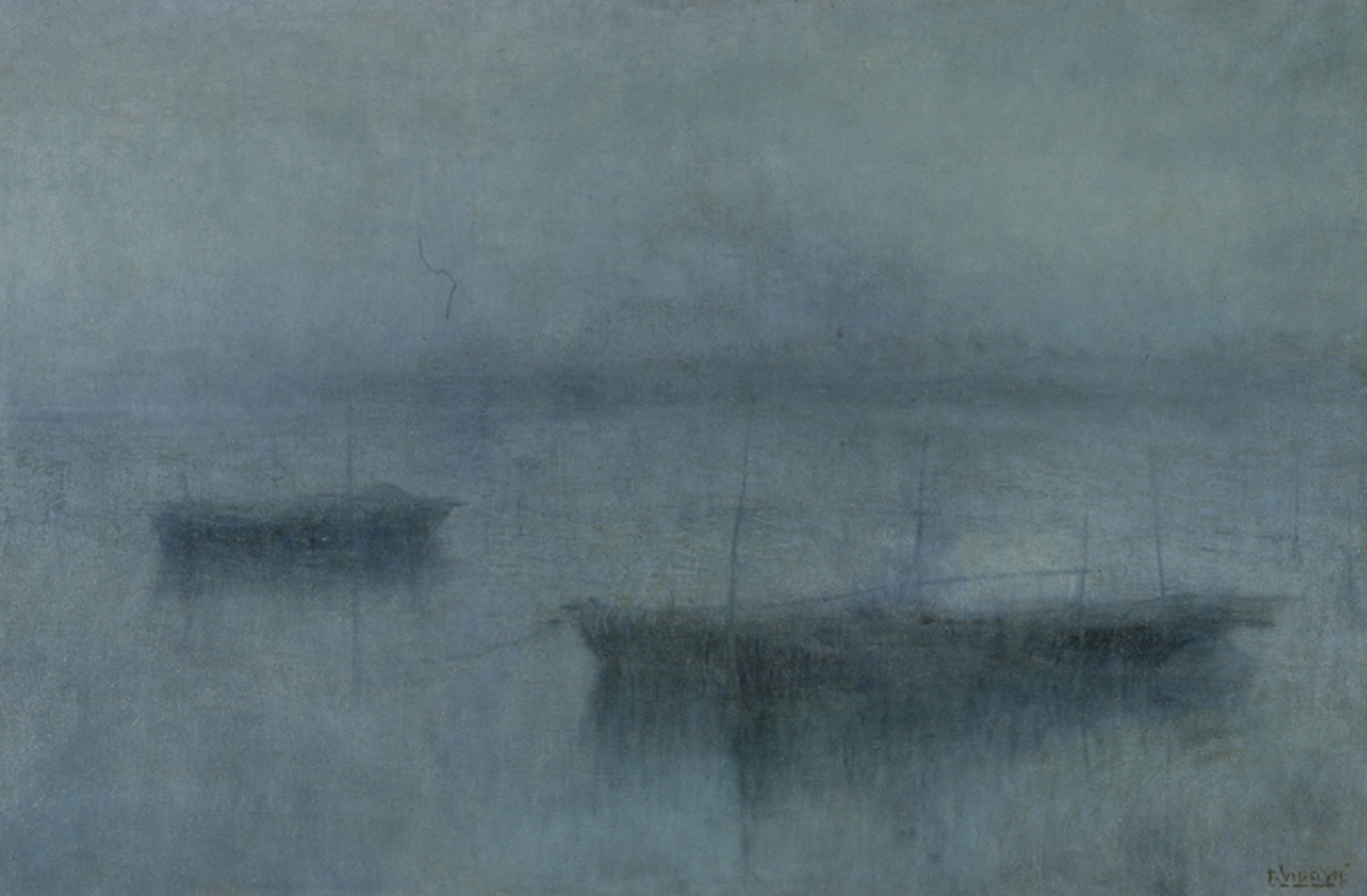 Emanuel Vidović (Split, 1870 - Split, 1953) was a Croatian painter and graphic artist, whose rich opus defined the period of modernism in Croatia. Born in Split on December 24, 1870, as the first child of Ivan Vidović and Paška, born Grubić, from early youth Emanuel showed interest in painting and drawing. After private lessons and preparations with Dr. Emil Vecchietti, he was admitted to the sculpture department of the Venice Accademia di Belle Arti in 1887. He left after only three years of study to devote himself to painting and bohemian life in Venice and Milan, eventually discovering the beauty of the fishing town near Venice, Chioggia. In this town, immortalized in his numerous vedutas, Vidović met his future wife, Amalia Baffo, with whom he would later have nine children. He soon returned to Split, where he began working at a school as an art educator, not giving up his artistic endeavors. In the early stages of his creation, Vidović created key works such as "Little World" (1904) and "Angelus" (1906/1907), marking the beginning of the period of symbolism and depictions of dusk landscapes of reduced chromatics. After World War I, his palette became darker, turning to interiors as main sources of inspiration. With trembling brush strokes, he notes the atmosphere of the interiors of churches, cathedrals, and his apartment and painting studio in Split. In his opus, still lifes, inhabited by fruit, dead fish and birds, and antique objects, dolls, clocks, palettes with brushes, and similar objects from the painter's working and living space find their place. Vidović continues his work during World War II, marked by disagreements with the ruling Italian political regime and rebellion against the appropriation of Croatian artists and art by the Italians. After turbulent war and post-war years, he continued to create and exhibit, remaining a significant figure on the artistic and academic scene. His later years did not hinder his artistic adventures, and he was active even in the last days of his life. He died on June 1, 1953, in his hometown of Split, after a long and severe illness. Although his life, like the lives of many other Croatian artists from the given period, was marked by many ups and downs, Vidović left behind a painting heritage that became the foundation of modernism and intimacy in Croatia. His opus has been the subject of numerous publications and retrospectives, from which we can highlight the most recent one - 'Emanuel Vidović: pasatist and modernist', held in 2018 at the Art Pavilion in Zagreb. At this retrospective, "Laguna", a work of timeless beauty and simplicity, was also exhibited. Dated between 1905 and 1906, "Laguna" represents one of the more refined and delicate achievements from Vidović's early creation, where the motif, as well as the palette, are reduced to their extremes. Therefore, we can observe and evaluate "Laguna" in relation to other significant works from the corresponding period, such as the already mentioned "Angelus" (1906/1907), "Twilight" (1903/1905), "From the Laguna" (1905/1906), "Fisherman's House" (1905/1906), etc. Bathed in airy mist, in the center of this elongated canvas we find the motif of a boat with a fisherman, while the gloomy horizon is vaguely indicated in the background. The scene radiates with the tranquillity found in the Dalmatian coast during cold dawns, when the first fishermen set out on their early morning ventures. Vidović observes and records this everyday scene through the prism of an artist, adding a meditative, almost metaphysical aspect to it through carefully constructed composition and a selected palette of colors. Seemingly, this work is monochromatic in its execution, built on a subtle gradation of blue tones. However, in these airy color applications, the sharp eye of the observer can discern subtle tones of pink, purple, and brown, under which the warm tone of the preparation shines through. These are skillful color games in which Vidović was an unmatched master and which he used sovereignly to form his atmospheric landscapes from the beginning of the 20th century. This mastery is especially expressed in "Laguna", which to the eye of the modern observer seems equally modern, innovative, and impressive as at the moment of its creation, more than 120 years ago.