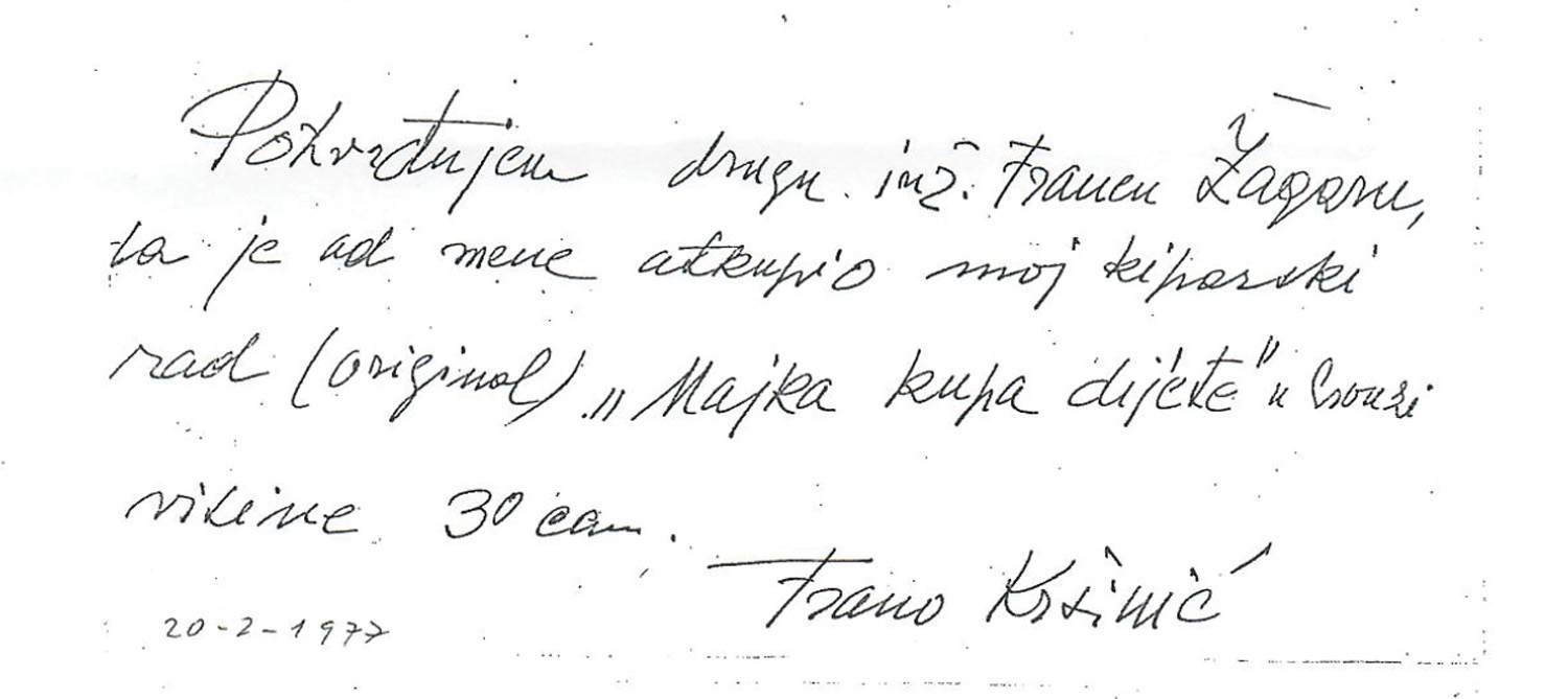 The work is accompanied by a written certificate of origin signed by Frane Kršinić, 1977.