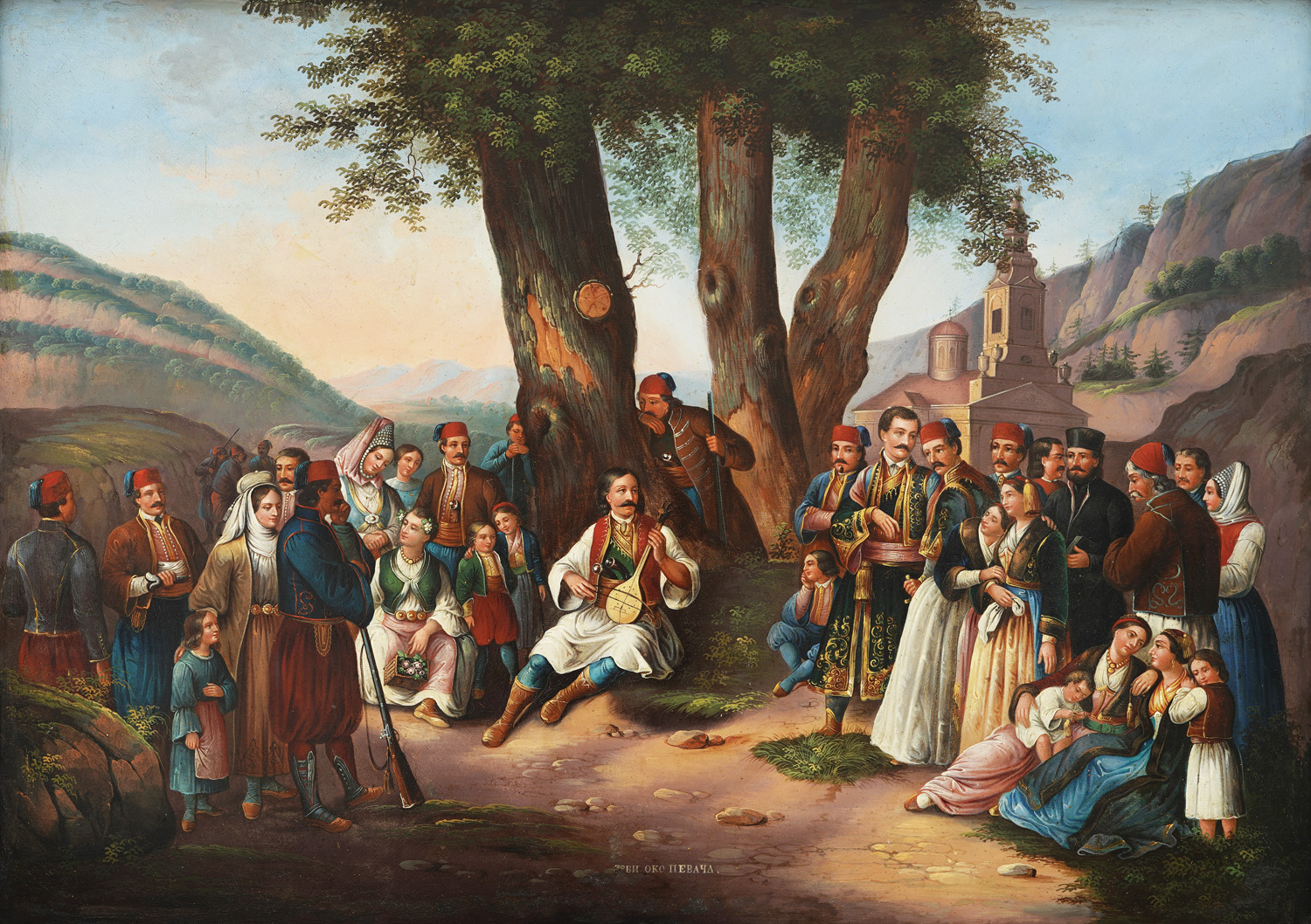 Anastas Jovanović (Vraca, Bulgaria 1817 - Belgrade, 1899) was a Serbian painter, graphic artist, famed as a photographer, and pioneer of Serbian modern visual arts. He was born in Vraca, in the then Ottoman Empire, today's Bulgaria, and as a young man he moved to Belgrade. His talent for art was recognized early on, and he received a scholarship from Prince Miloš Obrenović to study abroad. He studied at the Academy of Fine Arts in Vienna where he learned lithography. The lithography technique, revolutionary at his time, was used to create detailed portraits, illustrations, and historical scenes. His works depicted famous Serbian historical figures such as Princes Miloš and Mihailo Obrenović. As the first photographer, he photographed many celebrities and scenes from Serbia's 19th-century life. His photographs are documentary but also have an artistic character and often show members of the Obrenović family and scenes from everyday life in Belgrade. His work left an indelible mark on culture, combining technical innovation and artistic expression. The oil on tin "Serbs around the Singer" was created between 1848 and 1860. Jovanović first created a lithograph based on the template of Pavle Simić's "Serbs around the Guslar" which became extremely popular with the people. He then painted the same scene twice on tin - one copy is kept in the National Museum in Belgrade, and the other copy is the one that is in the possession of a family in Zagreb. At the center of the painting is a singer, or guslar. Guslars were respected folk singers who, while playing the gusle, sang events important to the community, often in the form of epic poems in decasyllabic versification. The figure of the guslar was later taken from the "Zagreb" painting and, under the name Filip Višnjić, was multiplied for the collection Famous Serbs of the 19th Century published by the Serbian Printing House in Zagreb. In addition to the singer, 33 people are depicted in nature and a church is visible in the background. Some of the people in the painting are Vuk Stefanović Karadžić, Prince Mihailo Obrenović, Toma Vučić-Perišić, Anka Obrenović, Anastas Jovanović (self-portrait in profile). Also identifiable in the painting are Montenegrin bishop Peter II, Petar Petrović Njegoš, Đuro Daničić, Branko Radičević, Jevrem Obrenović (the father of future king Milan) depicted while still a child. The painting is titled in Cyrillic with white paint in the middle below as "Serbs around the Singer". An version of this painting is in a private collection in Belgrade – a depiction of the guslar with the people but without a church in the background.