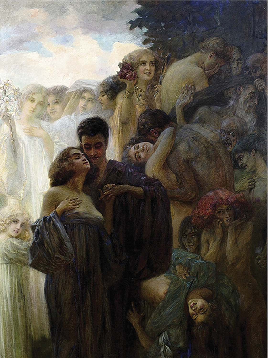 Robert Auer (Zagreb, 1873 – Zagreb, 1952) was a prominent Croatian painter, graphic artist and professor. Auer's education at the academies in Vienna and Munich during the 1890s enriched his painting with the spirit of secession, visible also in the work "Study with Figures". The work is a study for the famous canvas "Love", created in 1912, which completes the composition of the study and surrounds the lovers figure with a series of angelic, but also grotesque figures. Even in the contrasting colors of the background on the study, the symbolism of the later oil, tension and struggle of innocence and desire is indicated.