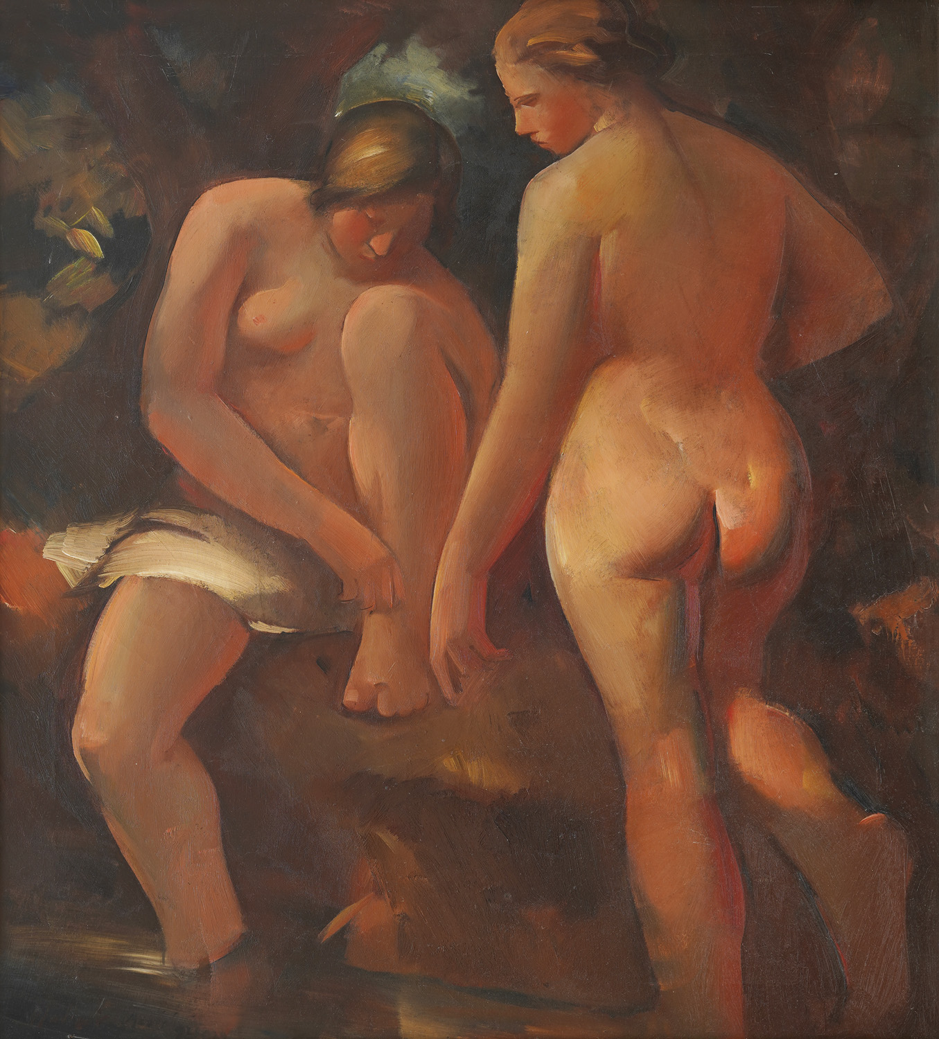The twenties of the last century in Becić's opus are marked on one hand with the Sezannist landscapes of bright colors created in Blažuj, the painter's summer retreat above Sarajevo, and almost sculptural nudes placed in open spaces painted in a post-cubist style. In fact, these are a kind of Euclidean tonal modeling's of earthy color tones that he mainly created in Zagreb from 1923. Becić's unique "stilkunst" on these nudes – the roots of which go back to the painter's schooling years in Munich (1905 – 1909), and the sense already expressed then for both the materiality of form and tonal modeling – was early recognized and praised by eminent critics of that time, for example, Vladimir Lunaček known as "Cave criticuma", who diligently wrote reviews of exhibitions at the Spring Salon, the Group of Croatian Artists and Ullrich Art Salon, where Becić regularly participated with landscapes from Blažuj, nudes and still lifes as well as Zagreb views and landscapes then rural Šestine and Kraljevac. The oil painting "Two Acts", signed by the author in 1929, thus, at a time when Becić had already been a professor of painting at the Academy of Fine Arts in Zagreb for six years, goes in line with his first-rate creations from the so-called post-cubist section of his opus. The tonally attuned palette, surprisingly precise and broad brush strokes with which he shaped the voluminous figures of the female body in factographic and chromatic value - are features of his painting that this painting vividly demonstrates. The further course of Becić's creativity took place in the circle of "Four: Babić, Becić, Miša, Vanka" who, with the departure of Maksimilijan Vanka to the USA (1930), became the "Group of Three", a three-member group of painters who for decades largely led and determined the direction of Croatian painting in the first half of the 20th century. BRP