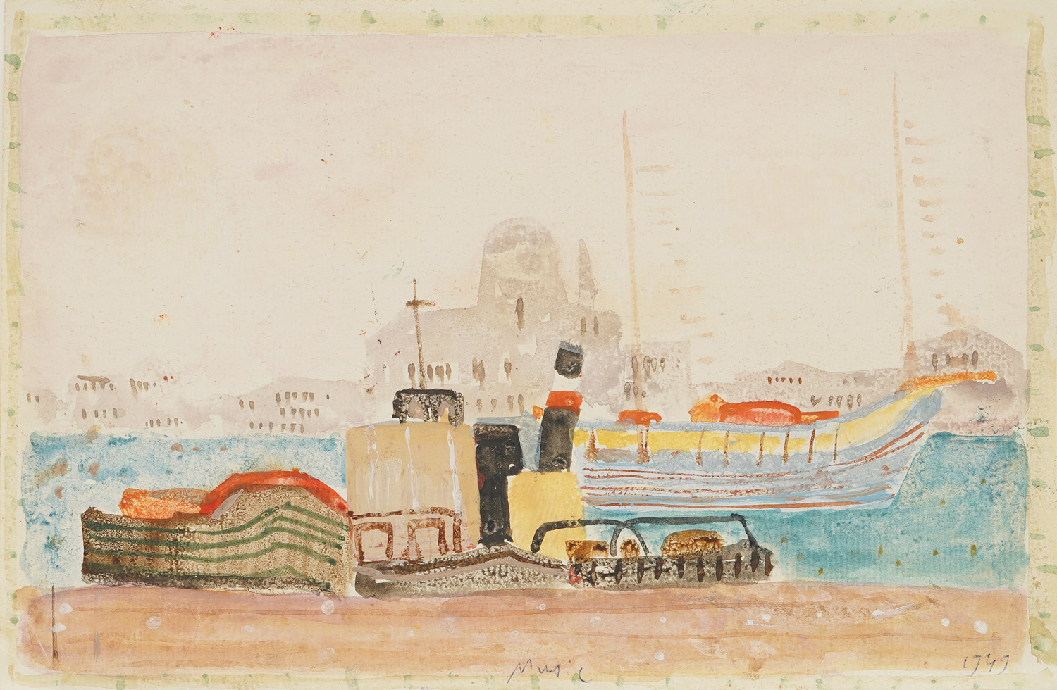 Zoran Antonio Mušič (Bukovica, 1909. – Venice, 2005.) was one of the most prominent Slovenian artists of the 20th century, known for his bright, warm landscapes, still lifes, and portraits. He received his artistic education at the Academy in Zagreb, from 1945 he lived in Venice, and from 1953 in Paris, thus expanding the area of his activity beyond the borders of then Yugoslavia. During his stay in Venice, Mušič's works were exhibited in the Palazzo Sagredo and at the Venice Biennale, and Mušič gradually established contacts with the international art scene. The painting "Venice, Ships" was created in the years after World War II, a period marked by the experience in Dachau, which Mušič would later also depict in the cycle "We are not the last".