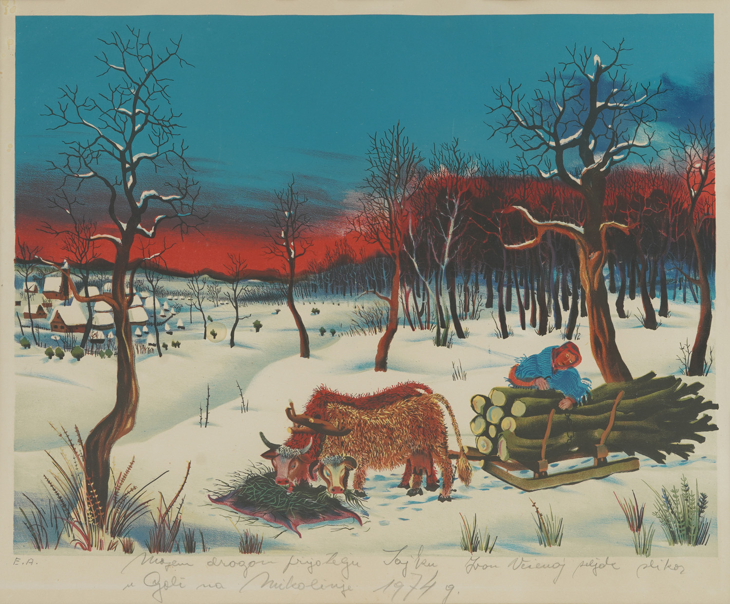 Signed and titled outside of the scene lower right, in pencil, "Ivan Večenaj peasant painter"; dedicated and dated outside of the scene middle bottom, in pencil, "To my dear friend Sajko in Goli on St. Nicholas Day 1974."; noted lower left, in pencil, "E.A."