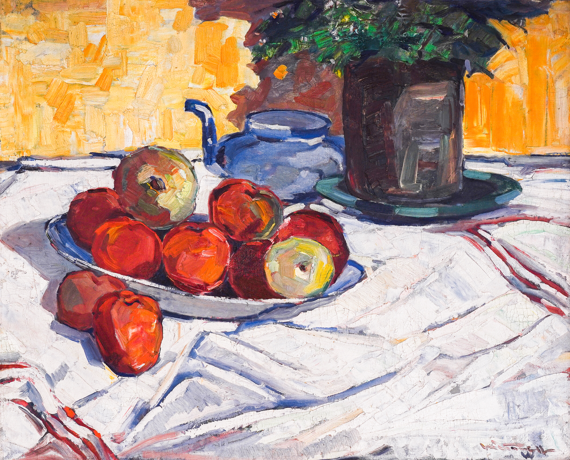 Nikola Tanev is one of the most significant landscape painters from the first half of the 20th century. He studied (1908-1912) at the Academy of Decorative Arts in Paris under professors Paul Renoir and Manzhan, and he attended the École des Beaux-Arts and the Grande Chaumière. In 1910, he visited Claude Monet's studio in Giverny. He returned to Bulgaria in 1912 and the same year he set up his first solo exhibition in the Trapkova gallery. Almost every year, Nikola Tanev presents his exhibition, sometimes more than one (a total of 55, of which 27 are abroad). He participates in all exhibitions of the "Native Art" society, of which he is a member, in all UHI and international exhibitions of Bulgarian artists. The beauty of the Bulgarian Revival town comes alive in Nikola Tanev's Karlovo yards. Still life is also present in his work, albeit much less often. In "Still Life with Apples and Blue Teapot" Nikola Tanev applies all the principles of work that he applies in the famous Karlovo yards - bright sunlight, classical light-shadow construction of the forms - warm lit fields and cold shadows. The composition is clear and strongly influenced by Cézanne's still lifes. On a white tablecloth are a dish with orange apples, a blue teapot, and a black cylindrical vase or pot with green plants. The background is constructed in Indian yellow and ochre. The painting is characteristic of the artist's style in the 1930s when he created some of the highest achievements in his work. (S.N.)