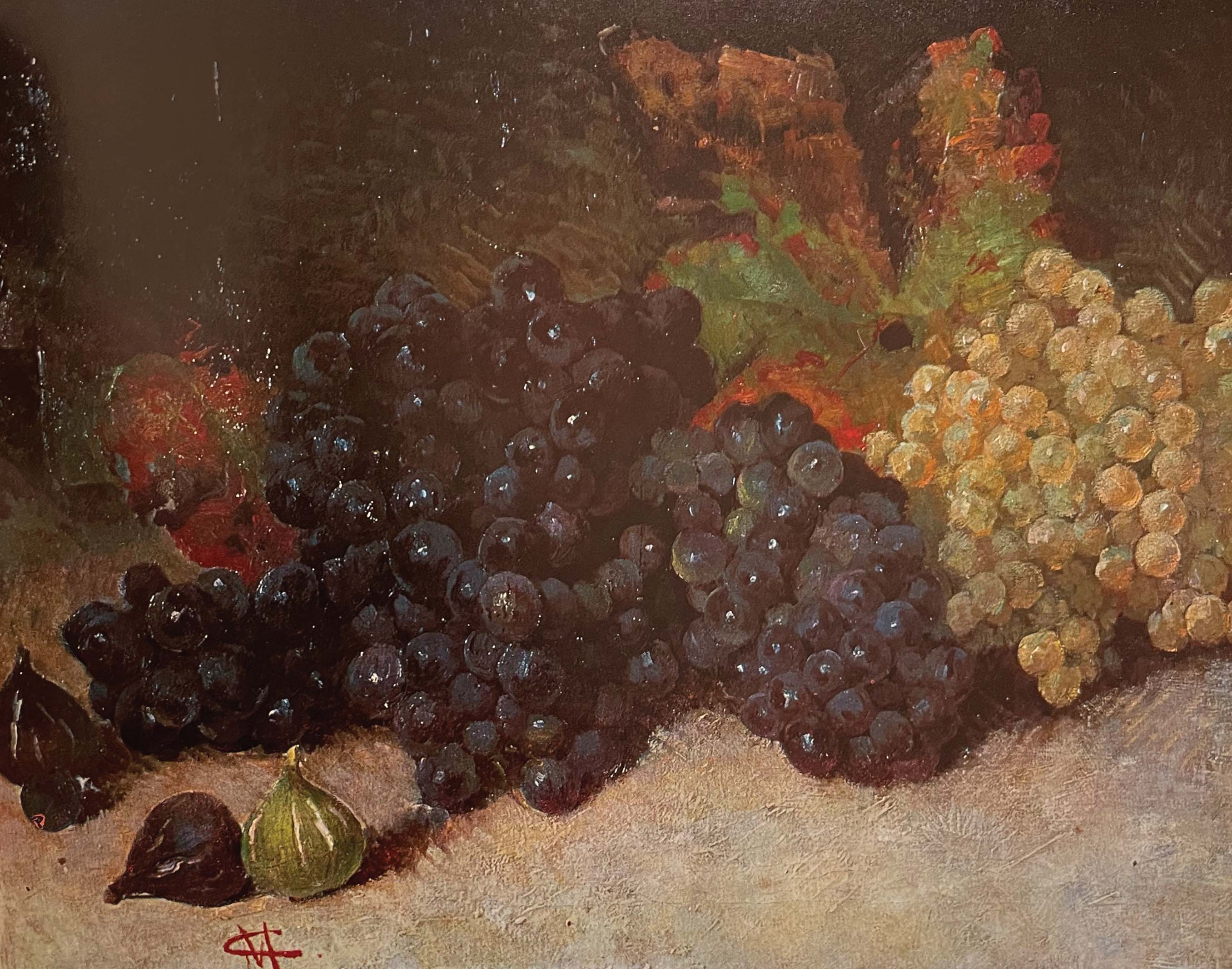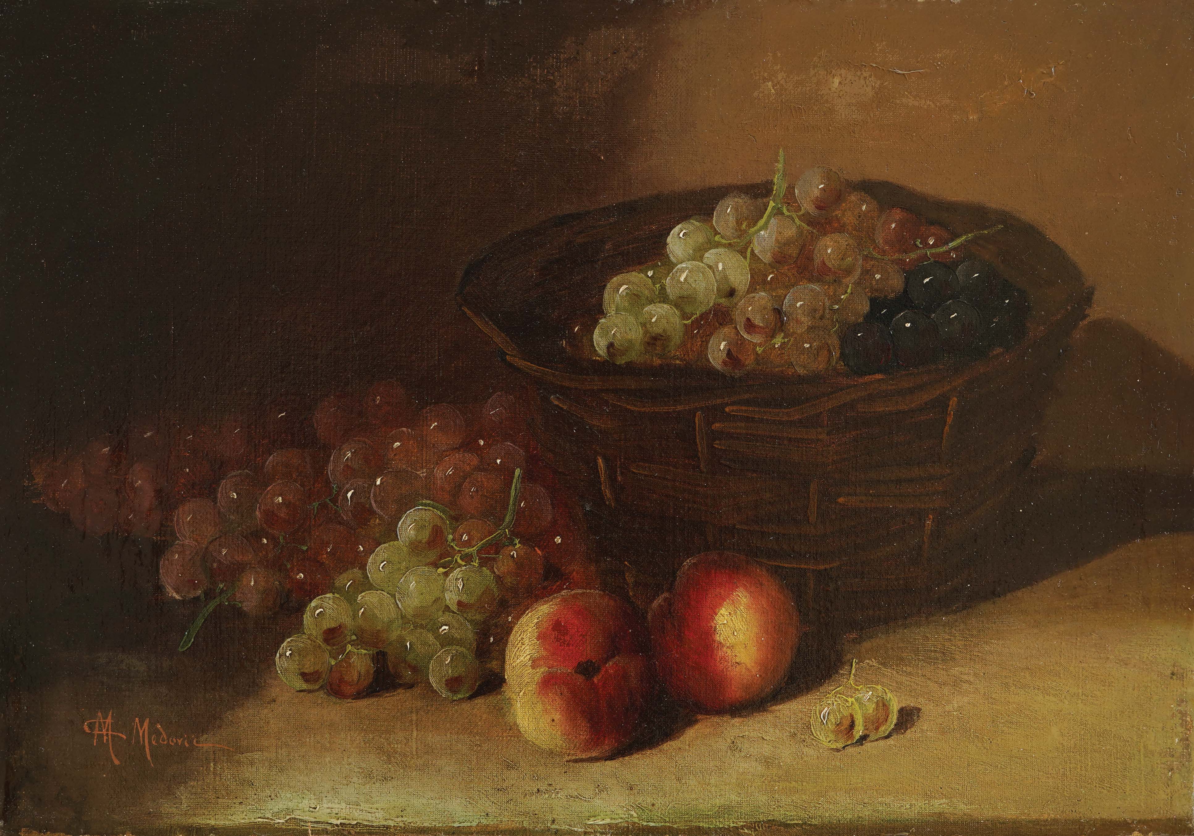 Slikar Mato Celestin Medović (Kuna, 1857. - Sarajevo, 1920.) jedan je od rodonačelnika i ključnih predstavnika slikarstva hrvatske Moderne. Kao mladić odlazi u Dubrovnik gdje se školuje te nešto kasnije i zaređuje u franjevačkom samostanu Male braće. Njegova se umjetnička karijera razvija postepeno te započinje izradom crteža. Prekretnica se u Medovićevu stvaralaštvu zbila 1879. godine, kada ga posjećuje budući bliski prijatelj Vlaho Bukovac i ohrabruje da počne slikati uljem na platnu. Ubrzo započinje studij slikarstva u rimskom samostanu San Isidoru, okupljalištu Nazarenaca, s kojima, međutim, ne uspijeva pronaći zajednički stilski jezik. Nakon više godina boravka u Italiji, tijekom kojih proučava i slikarstvo starih majstora, upisuje Münchensku akademiju i počinje slikati historijska djela većih dimenzija. Idućih godina Medović se povremeno vraća u rodnu Kunu, a zatim više od desetljeća provodi u Zagrebu te uz Bukovca usvaja plenerizam. Posljednjih dvanaest godina života pelješki se slikar, uz kraći boravak u Beču, vraća u svoj rodni kraj, što se odražava i u njegovim omiljenim slikarskim motivima tog razdoblja. Medovićev stilski razvoj ne prati uobičajenu faze slikarskog sazrijevanja. Intenzivnije se počinje baviti slikarstvom tek za vrijeme boravka u Rimu gdje, unatoč protivljenju nazarenskoj stilizaciji i akademskoj dosljednosti, slika uglavnom sakralne motive bez živih modela. Odlaskom na Münchensku akademiju kao tridesetogodišnjak, slikar se počinje oslobađati zastarjelih slikarskih pristupa i izrađuje svoje prvo afirmirano remek-djelo, Bakanal, koje će nagovijestiti njegove stilske mijene u nadolazećoj „zagrebačkoj fazi“. Tada, uz poneke portrete, uglavnom izvodi velike historijske kompozicije te se priklanja historicističkom akademizmu sa zamjetnim prodorima realizma i naturalizma. Boraveći i radeći u Bukovčevu atelijeru preuzima njegovu sklonost improvizaciji, temperamentan potez te snažniji i svjetliji kolorit. Tijekom posljednjeg desetljeća života Medović na Pelješcu više no prije slika u neposrednom kontaktu s prirodom. Ondje stvara plenerističke krajolike s mediteranskom vegetacijom okupanom svjetlošću ili morske pejzaže. Upravo se u ovom zrelom razdoblju sve više okreće i mrtvoj prirodi, slikajući plodove zemlje ili mora. Ovdje predstavljena slika Mrtva priroda spada u niz Medovićevih varijacija na motiv jesenjeg voća. Riječ je o nenametljivoj kompoziciji sastavljenoj od nekoliko svakodnevnih elemenata – plodova slikareva zavičaja okupanih zlatnom svjetlošću ranojesenjeg sunca. S par vidljivih poteza kistom Medović je vješto prikazao zaobljene zrele voćke i čvrstu pletenu košaru, ovlaš definirajući njihove oblike. Paleta boja je topla, no relativno suzdržana i smirena, pokrenuta samo titrajima vršnog svjetla na grožđu izvedenim uz pomoć točaka i crtica bijele pastozne boje. Slika je potpisana u donjem lijevom kutu, gdje se izduženi inicijali slikarevih imena preklapaju. Riječ je o tipičnom slikarevom potpisu koji je koristio u prvom desetljeću 20. stoljeća.