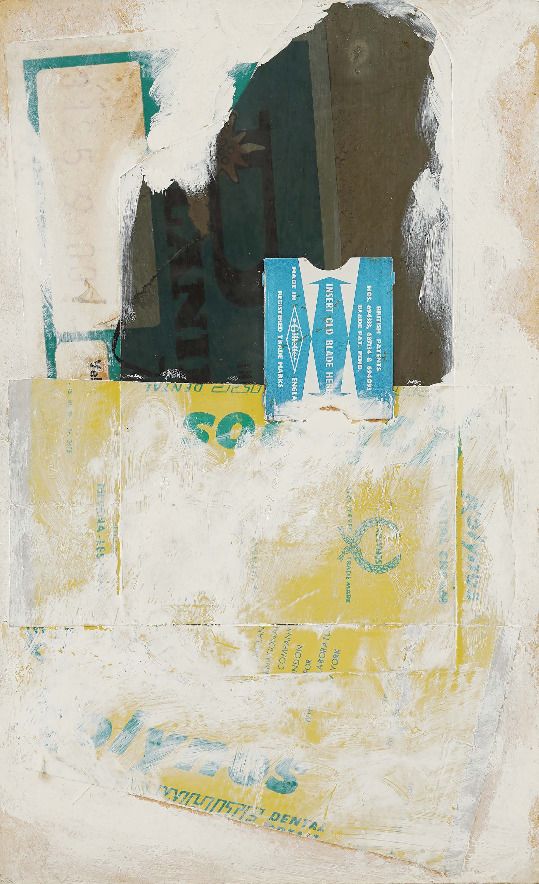 kolaž (Gillette ambalaža, Kolinos pasta, stara karta (Plani...) na kartonu