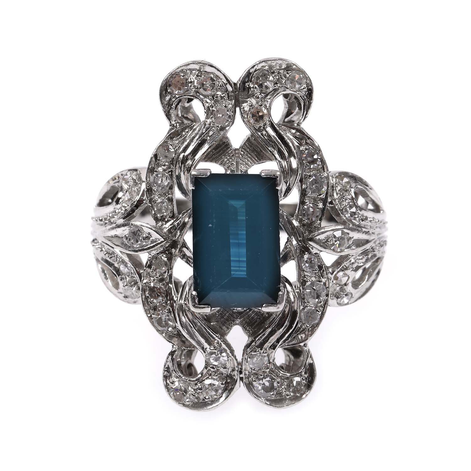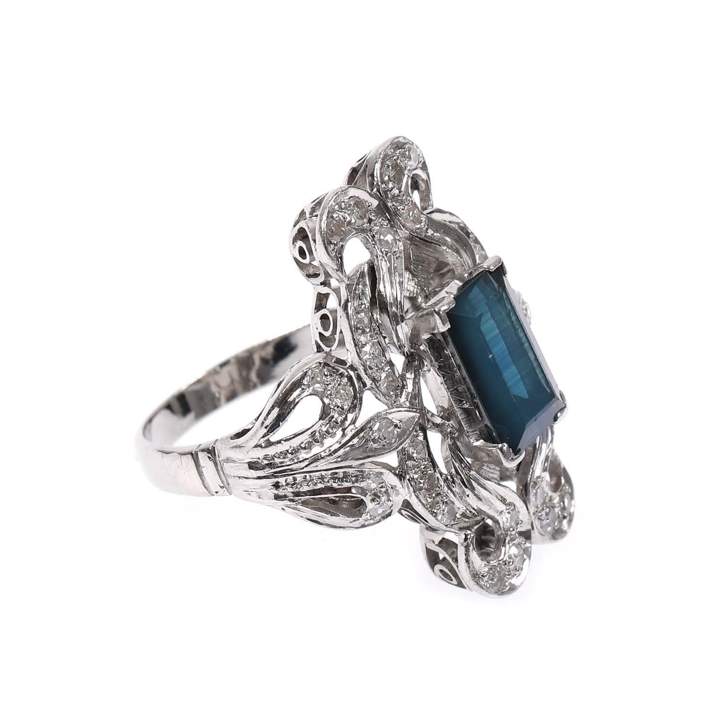 1 rectangular step cut sapphire, blue-green color, SI clarity, approx. 2.57 ct. and 34 single cut diamonds, color, HK, clarity SI1-I2, approx. 0.46 ct.