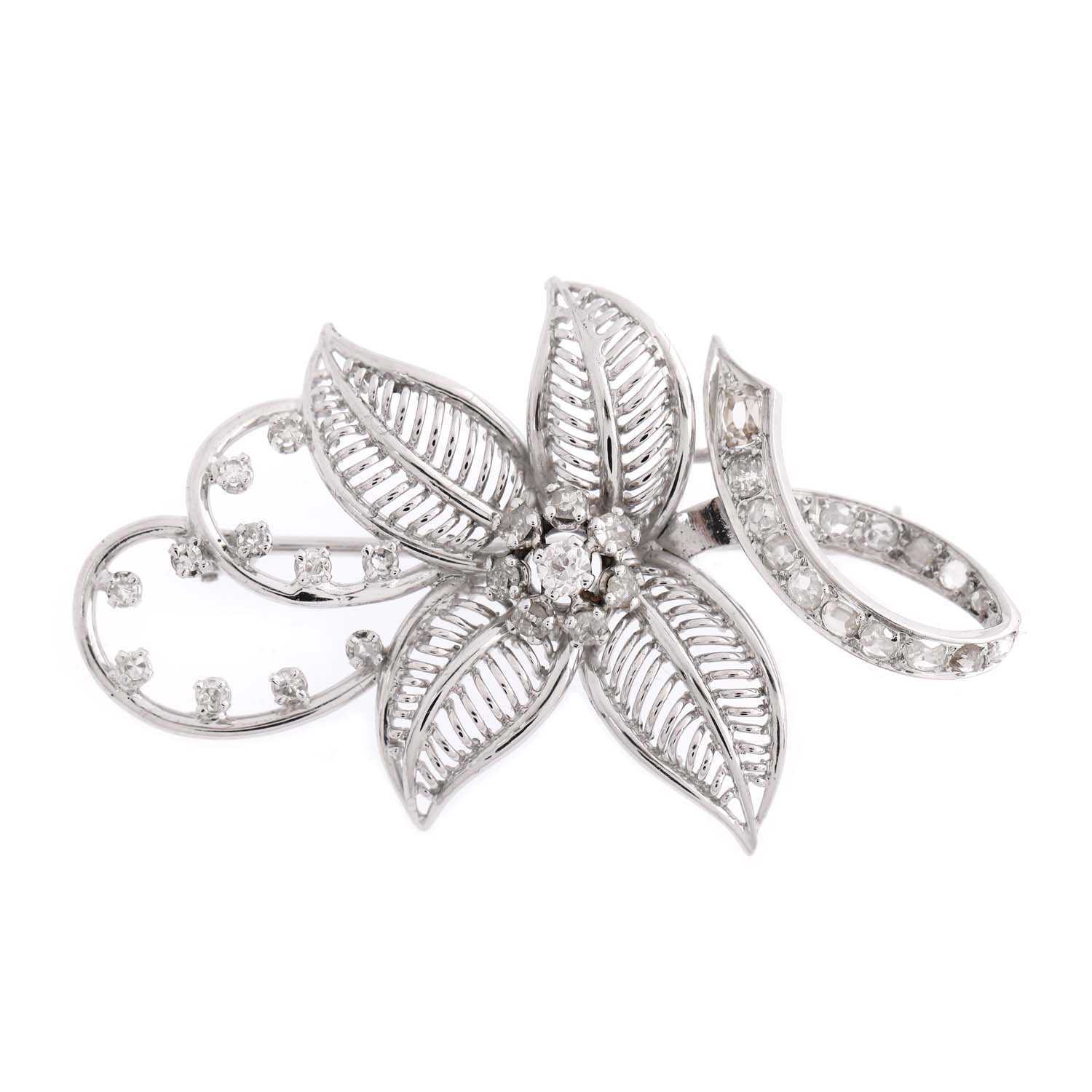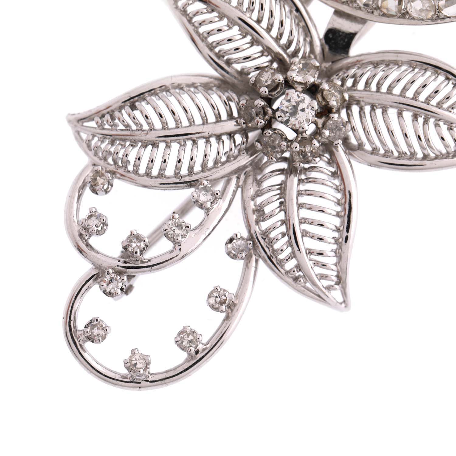 75. Gold brooch, made in floral shape, decorated with diamonds